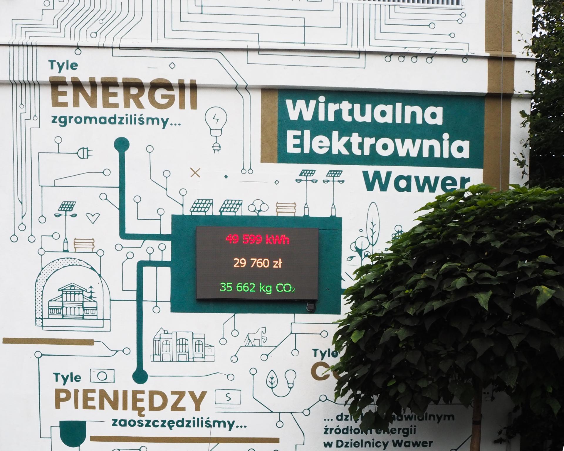 The mural with a digital display is one of the projects that make up the Wawer’s Claster of Energy. It is an element of activities aimed at struggling for a clean natural environment in Warsaw. The installation shows the residents how much money has been saved through renewable energy sources. Every resident of Wawer who has a photovoltaic installation in their home can connect to the Virtual Power Display. This action connects the direct efforts for green energy with its measurable results.