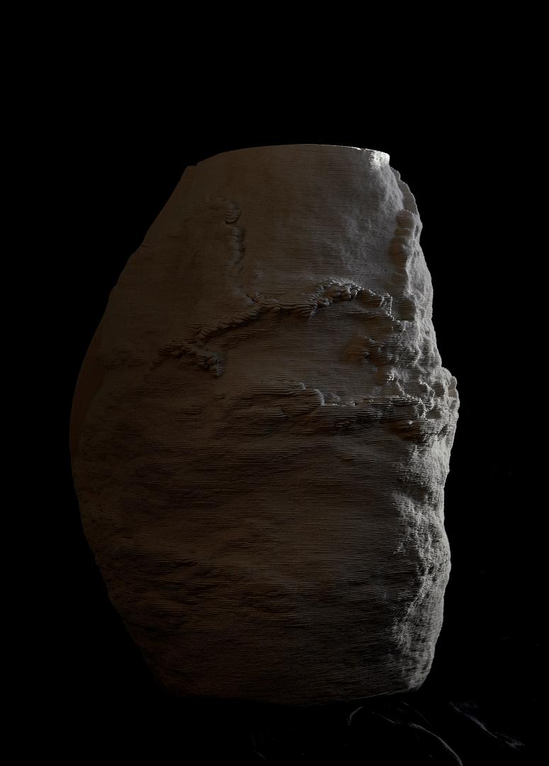 The pieces portray the mixture of these techniques. On the one hand the mark of the machine (layers, blotches and protrusions), and on the other hand the manual work thanks to the behaviour and memory of the material, always present. If the industrial revolution removed the hand, the digital revolution reintroduces the uniqueness of the single process. We like the singularities that appear in the process; the response of the material to gravity and the friction in the transfer of information between the 3D model and the machine.
