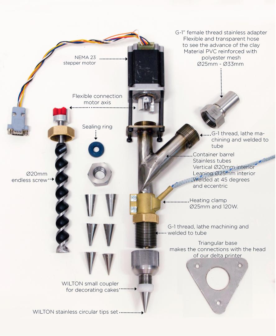 - Clay extruder - Dry clay extruder to 3D print large pieces of ceramics (up to 1 metre) using less than 20% of humidity.