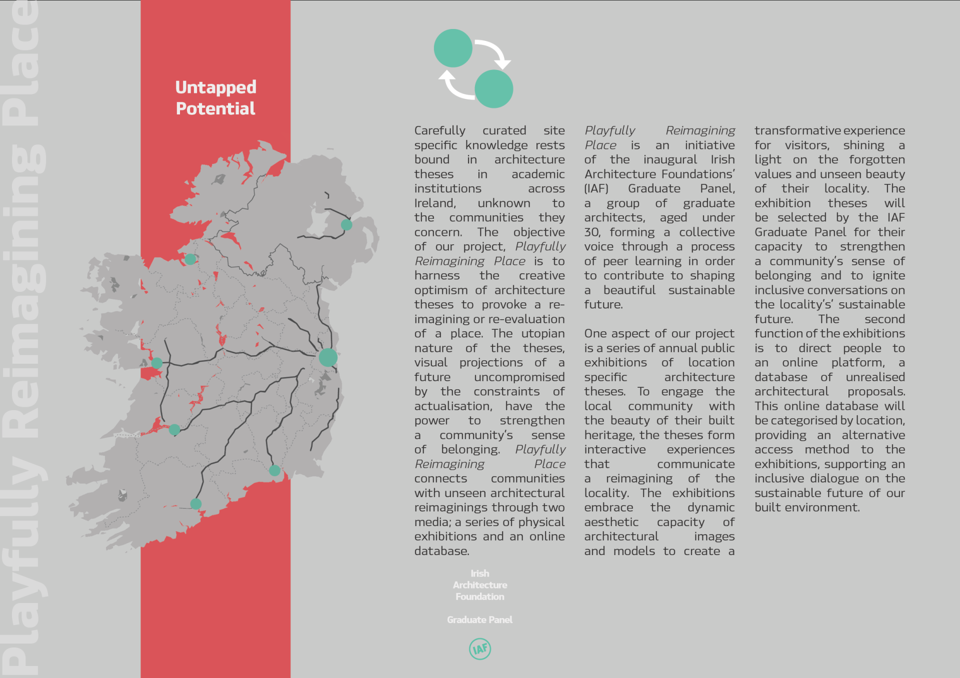 Carefully curated site specific knowledge rests bound in architecture theses in academic institutions across Ireland, unknown to the communities they concern. The objective of our project, Playfully Reimagining Place is to harness the creative optimism of architecture theses to provoke a re-imagining or re-evaluation of a place. The utopian nature of the theses, visual projections of a future uncompromised by the constraints of actualisation, have the power to strengthen a community's sense of belonging. Playfully Reimagining Place connects communities with unseen architectural reimaginings through two media; a series of physical exhibitions and an online database.