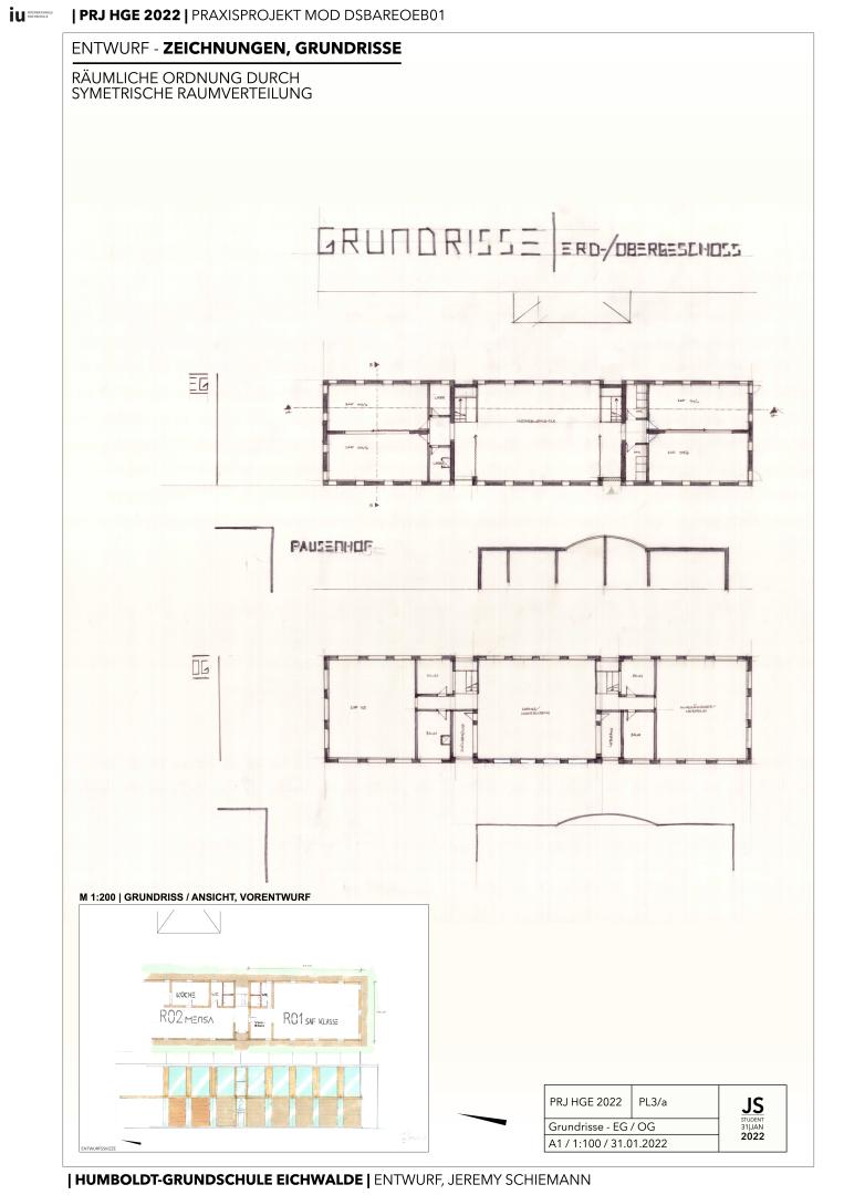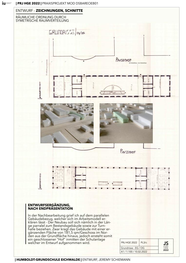The structure of the school is a simple one - two stories of educational and communal space are integrated into a narrow strip, parallel to the existing school-building to the West who'm now form a fully inclosed courtyard with one another. The aula as well as canteen are based in the center of the building and classrooms each on the Northern and Southern fringes of the building - the classrooms (4x) have a generous area of 50-60 qm wich allows children and teachers enough space to envision their own dimensions of learning.