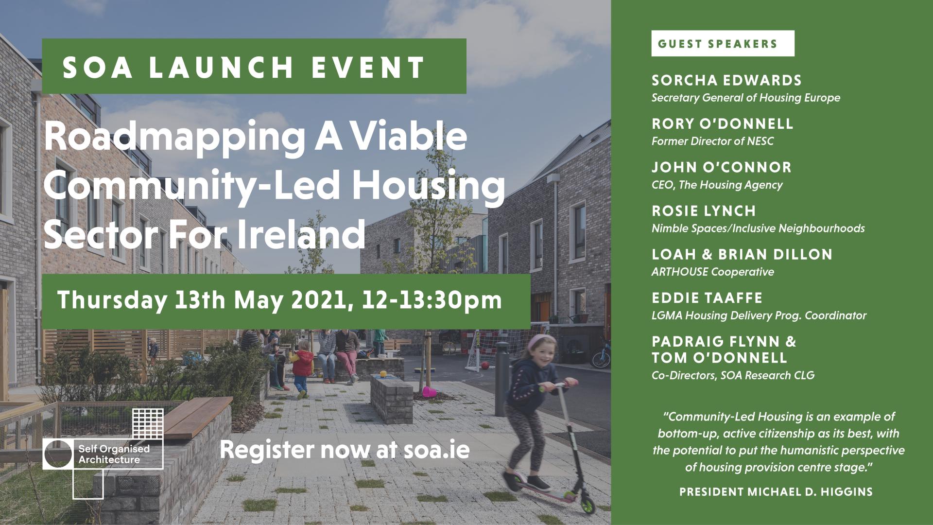 -The Project was endorsed by the President of Ireland, who agreed to write the Foreword. He writes “I so welcome the ideas put forward by SOA Research in this new book, Roadmapping a Viable Community-Led Housing Sector for Ireland…Community-Led Housing is an example of bottom-up, active citizenship as its best, with the potential to put the humanistic perspective of housing provision centre stage, with communities and citizens at the heart of neighbourhood development, embracing the idea of homes as a social good.”