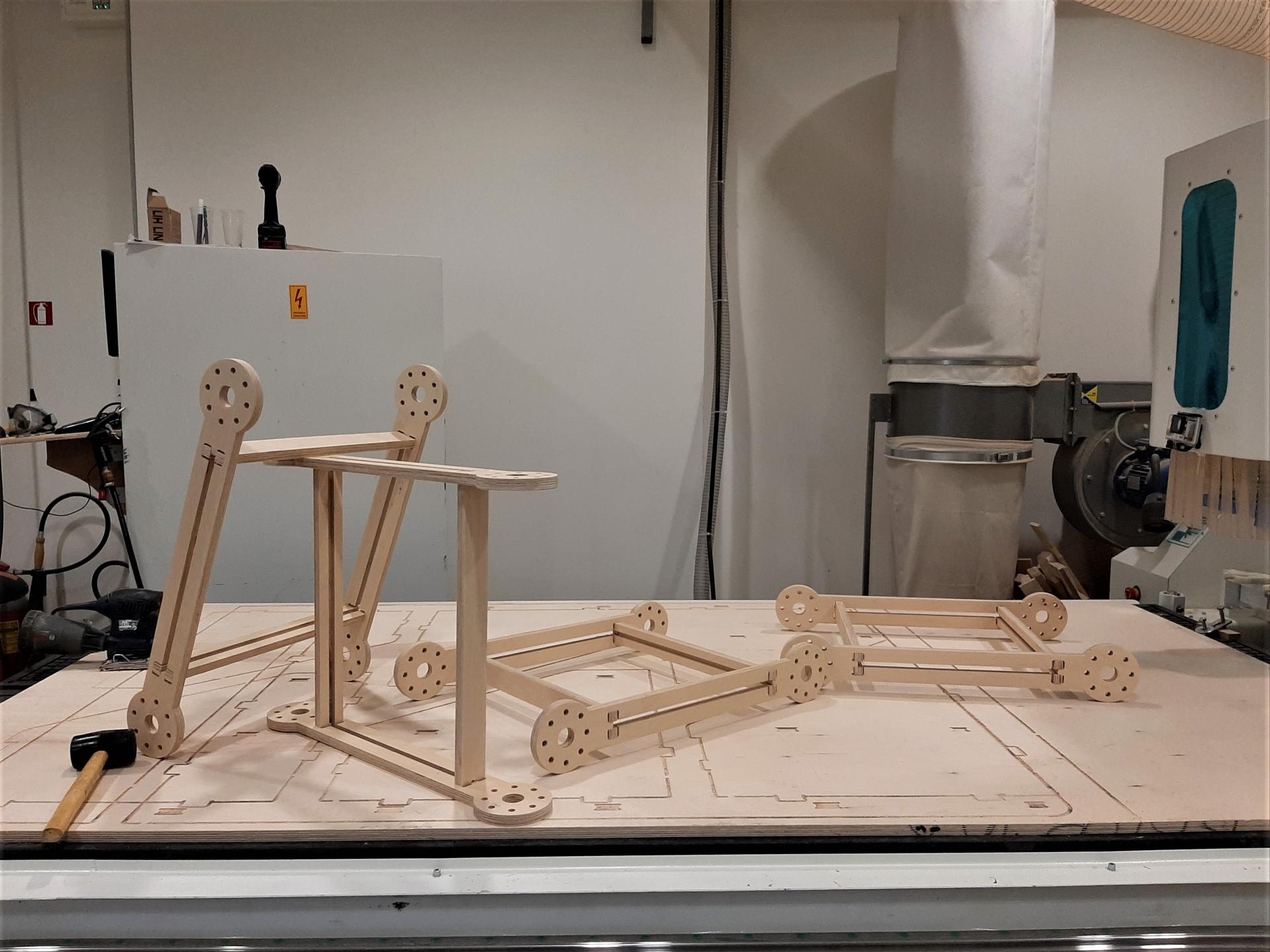 The application of this project can address many usage scenarios. However for the 'playful participation' concept for which it was created, it is applied through a creative integration process that although not linear could be decomposed into the following stages: Firstly, the action is planned (topic, target audience, number of participants, objectives). Activities that could be integrated on its surfaces are prepared and designed (boards or posts, maps adapted to the size of the unit, printed material as references, posters) and tools and equipment needed are collected. All components fit to be stored in the space created when the structure is closed in the form of a cart. The construction 'leaves' the preparation stage as a cart containing all the required material and moves towards the field of action. In the second stage, the construction is secured in the suitable place and can be transformed into any shape that best serves the action, so as to highlight the material of the preparation and at the same time be an active part of it. At this stage the possible scenarios of use can be multiple and can also be alternated during the action. The last stage, at the end of the action, involves transforming the structure into a cart, placing it on the moving platform, storing the remaining material and leaving the site. An alternative option, in case there is no stored material or it has to be transported by a vehicle, is to remove the nodes that secure the modular units at specific degrees so that the structure gains the agility enabling it to adapt to the vehicle. It is to be noted that all the processes involving transportation, set-up and transformation of the structure can be easily done by one or two persons, since it is quite light and easy to handle. Its presence in workshops has already inspired professionals and collectives, who have expressed interest in using it in events such as urban sustainability and circularity workshops, open neighbourhood actions etc.