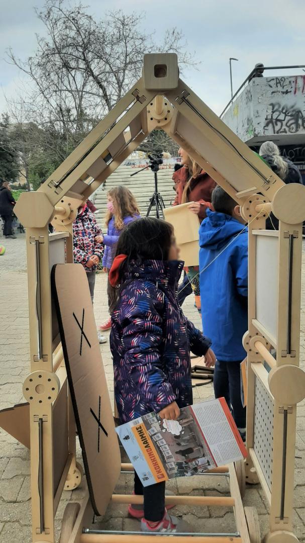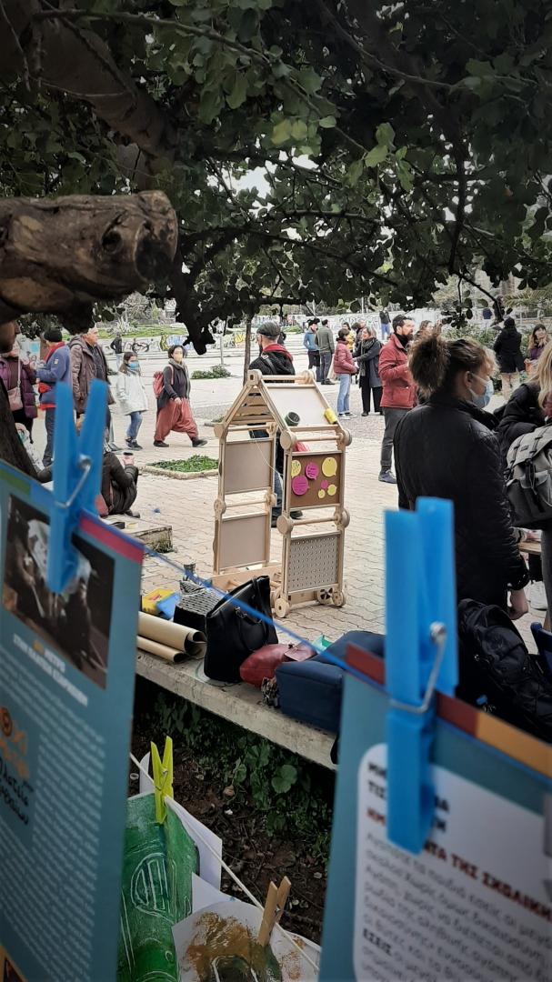 This project endeavours to address the terms of sustainability on three levels. Firstly, through the design of the construction, secondly, through the materials used and thirdly and most significantly through the purpose of its creation. The construction is transformed in order to meet the needs that arise at all stages of the implementation of a participatory action in public space. The materials used are all ecological and recyclable. The main volume of the structure is made of wood, while the materials of the individual surfaces that alternate in the modular units are various types of paper structures, which may be derived from creative reuse (such as cardboard boxes). Αll the wooden pieces that make up the main frames and the individual components (nodes) are designed to fit into small wood rattles, so that leftover wooden parts can be used. The modular unit is designed to have the minimum amount of material capable of keeping the construction stable. Beyond the construction itself, however, its idea and purpose is to contribute to the transformation of perceptions of urban planning processes, to the understanding of the dynamic changes of public space and to the redefinition of the way we think and co-plan the city in terms of sustainability. After all, sustainability of urban planning in contemporary urban theory is intertwined (for a wide part of the interdisciplinary community) with the active engagement of citizens at all stages of planning. Collective actions and workshops, therefore, that enhance the participation of people and communities in urban events, through mapping activities, discussions, interviews, participant observations and recordings, consist the fundamental basis for the development of urban planning strategies that respond to citizens' needs and thus fulfil some of the most essential terms of sustainability of the future European city.