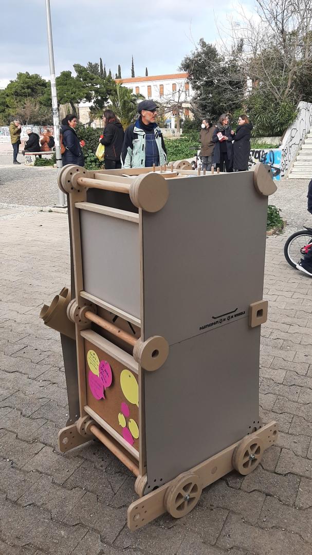 Participatory actions related to the commons, urban research and planning have an informal character in Greek cities and are usually implemented in an academic context or through private and community initiatives. Consequently, citizens are not familiar with such actions, which makes them feel uncomfortable and avoid participation. The working experience of the project team in participatory research and planning has indicated the need for new tools to revitalise such practices. The idea of a participation cart comes from design teams who have used mobile information booths in participatory workshops in the city of Barcelona. However, the innovative character of this project lies in the fact that it is a core of participation, managing to combine the enjoyable experience of participants and the facilitation of the organisers of public events. It is a playful tool that succeeds in addressing many of the challenges that may arise in an open action. It is mobile, it carries the necessary equipment, it is a landmark of an action, it can be turned into a workbench or an information booth, it can be used as a showpiece or a props for a workshop. It achieves all of the above through sustainable design. It is a lightweight construction with minimum use of material, minimum cost, easy to construct, to assemble and to reproduce. It is also easy to use, to transform and to change its surfaces, which makes it interactive and familiar to people who first encountered it. Above all, it is innovative compared to other participatory carts because it consists of one modular unit that is repeated six times to create many different forms, yet has the ability to be repeated as many times as needed to serve even more usage scenarios. In other words, its design allows for the addition or subtraction of parts, depending on the use and shape it needs to have. All these features contribute to the versatility, the inclusiveness and ultimately the innovation of the construction.
