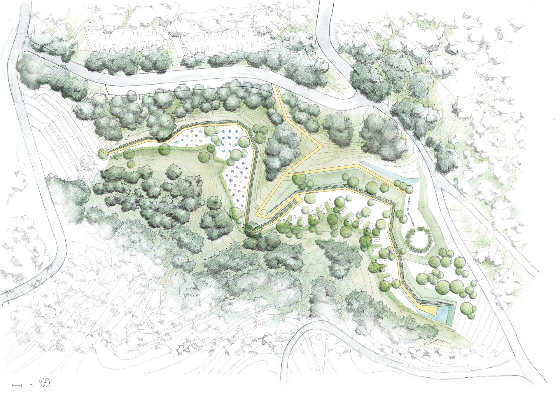 In recent years, traditional graves based in the burial of the deceased, tombs, pantheons, niches, ossuaries, columbariums, have lost demand against an increasing interest for cremation, and new ways of farewell regarding the ashes. While traditional burials demand hard constructions requiring large land areas, and need complex draining systems that avoid the polluting filtration of toxic leachate flowing from decomposing bodies, the burial of ashes allow new graveyards with less environmental impact, such as the ‘forest of stillness’, the ‘family trees’, or the ‘repose fountain’. Thus, the Krainer wall is proposed. An innovative system based on bioengineering applied to the landscape to create ‘the Forest Path and the Garden of butterflies’.