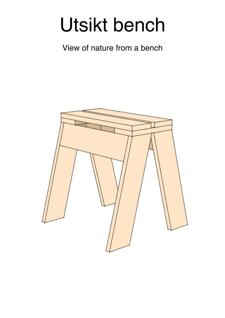 Utsikt is Swedish for view. The bench is a simple bench that can be put down in front of any type of nature. It is a way to highlight looking at our natural environment. It can be put in front of things like a little garden, plant, an old tree or in the middle of the forest. Over time it can become a symbol of our link with nature and a means to strengthen it. With free of use blueprints it can be built by anyone and put down wherever. It will be recognisable and spark curiosity.