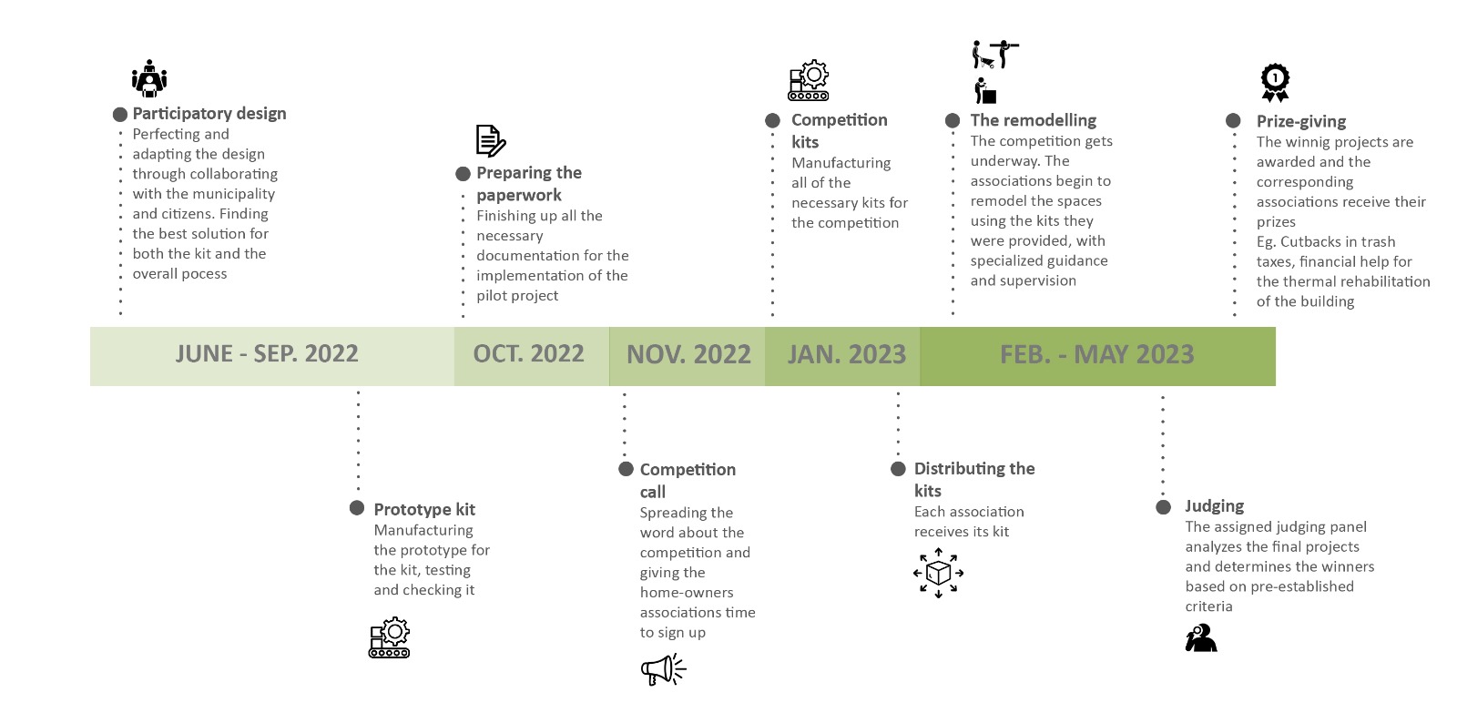 In the pilot phase, the prototype kit should be made available free of charge to owners' associations by the current applicants with the backing of the local administration of Oradea and UrbanizeHub, an NGO with experience in the field of sustainable urban regeneration. Additionally, a gamification component is foreseen, in the form of a local landscaping competition between five (up to 15 depending on the secured funds) owners associations.