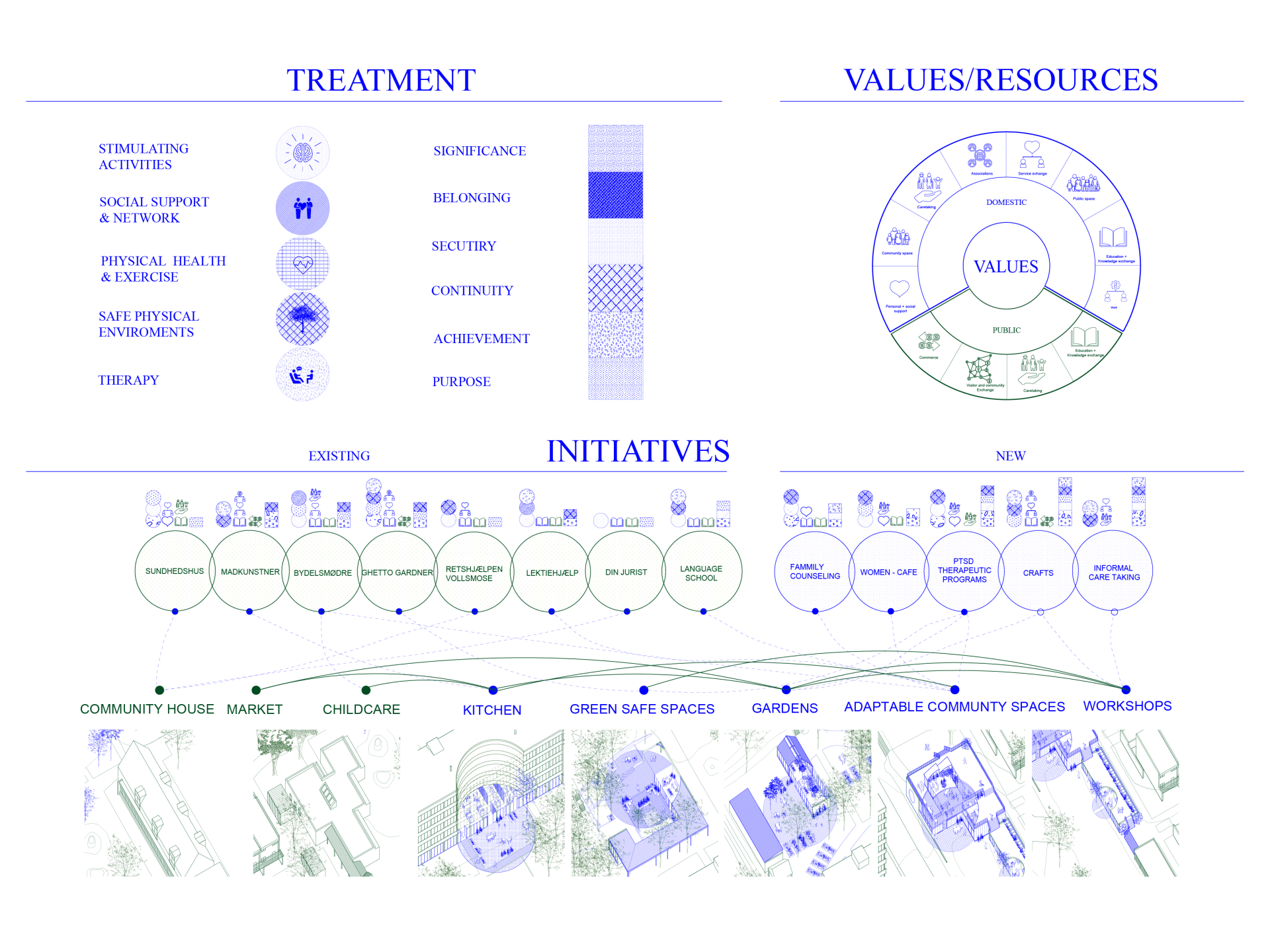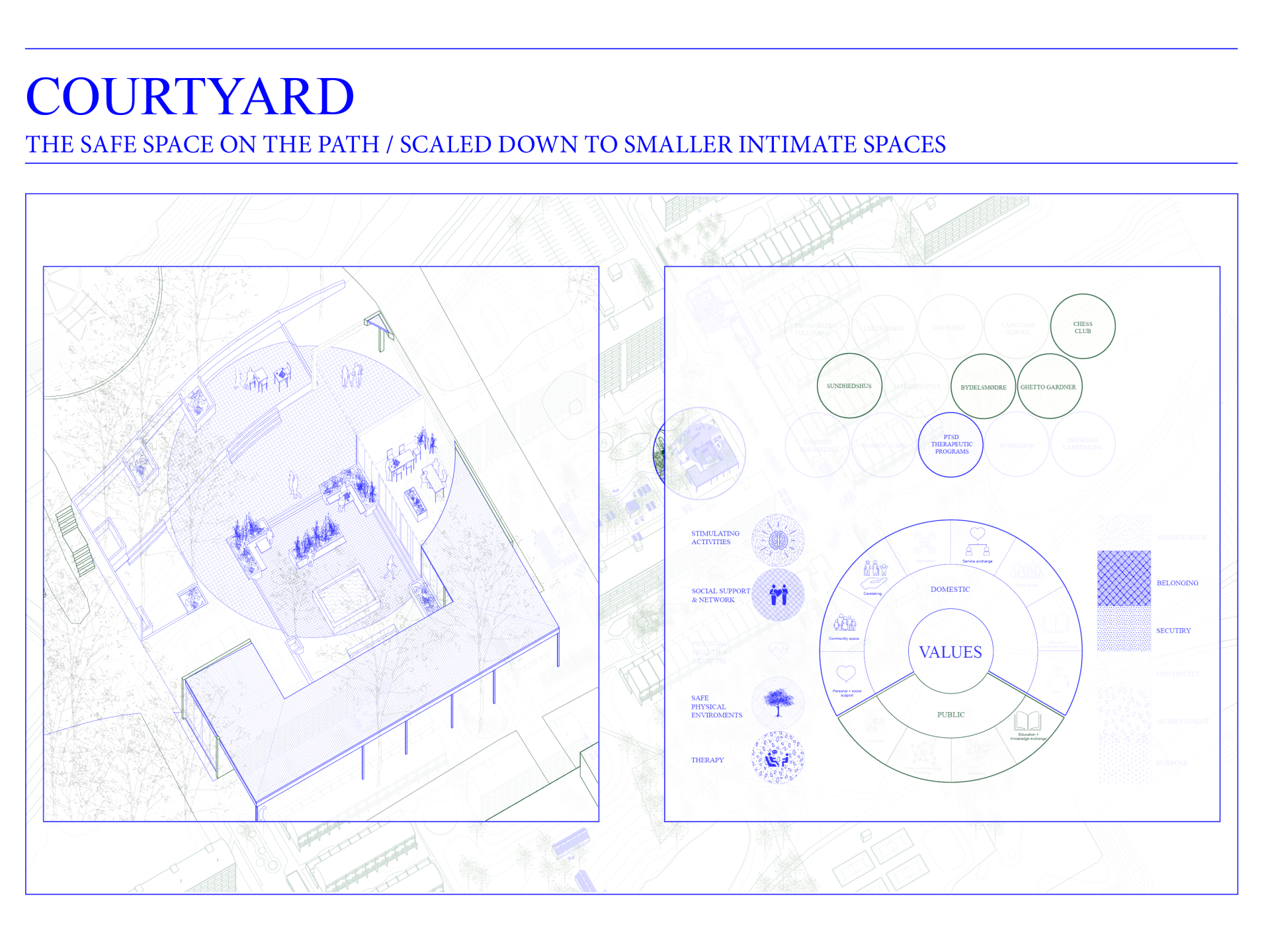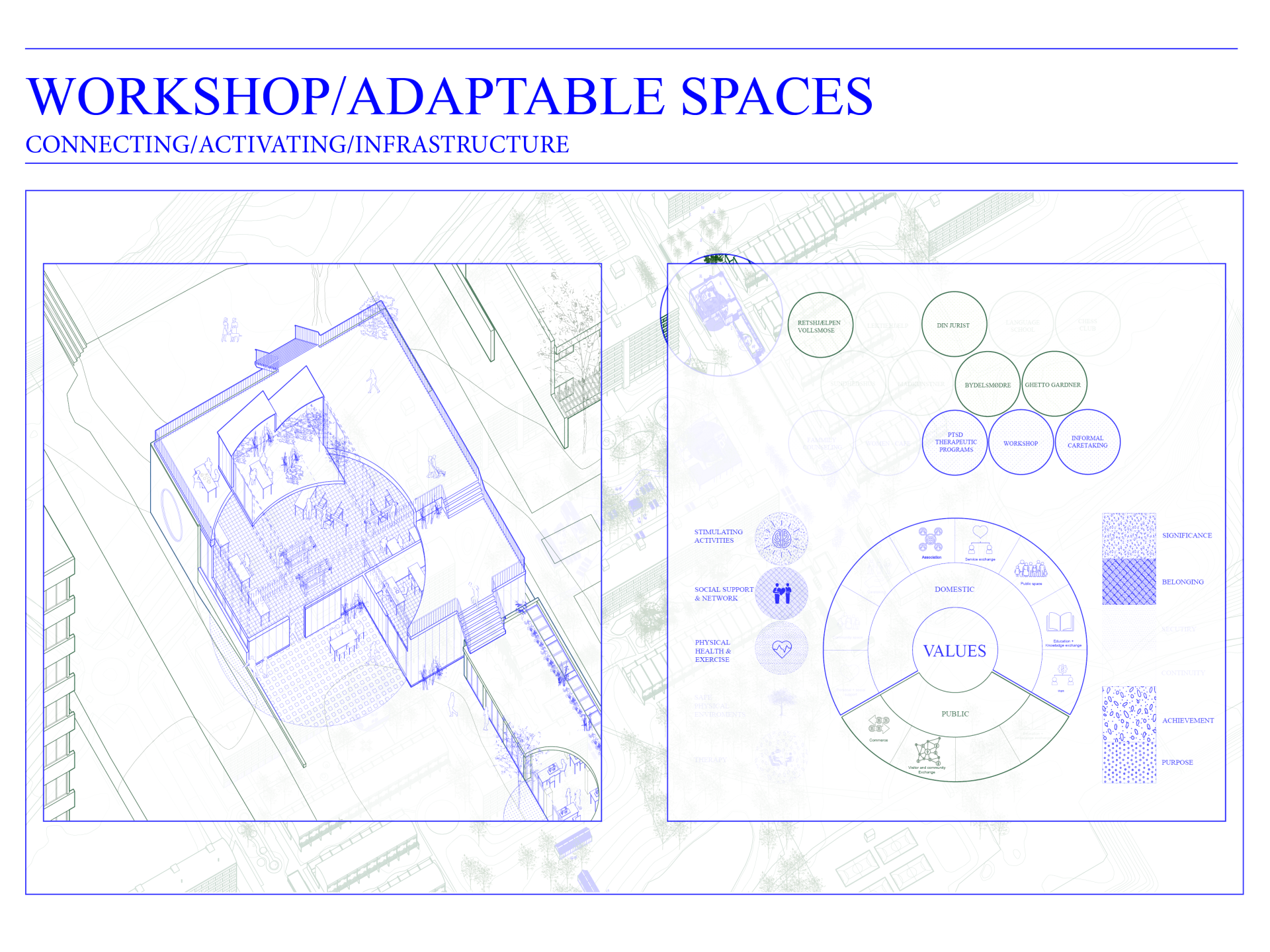 This project explores the existing values, the strong community, and the problems of the Danish “Ghetto” Vollsmose. With a focus on local initiatives, the concentration of people effected by PTSD and critical spaces of the area. The concept seeks to treat the issues through architectural initiatives.