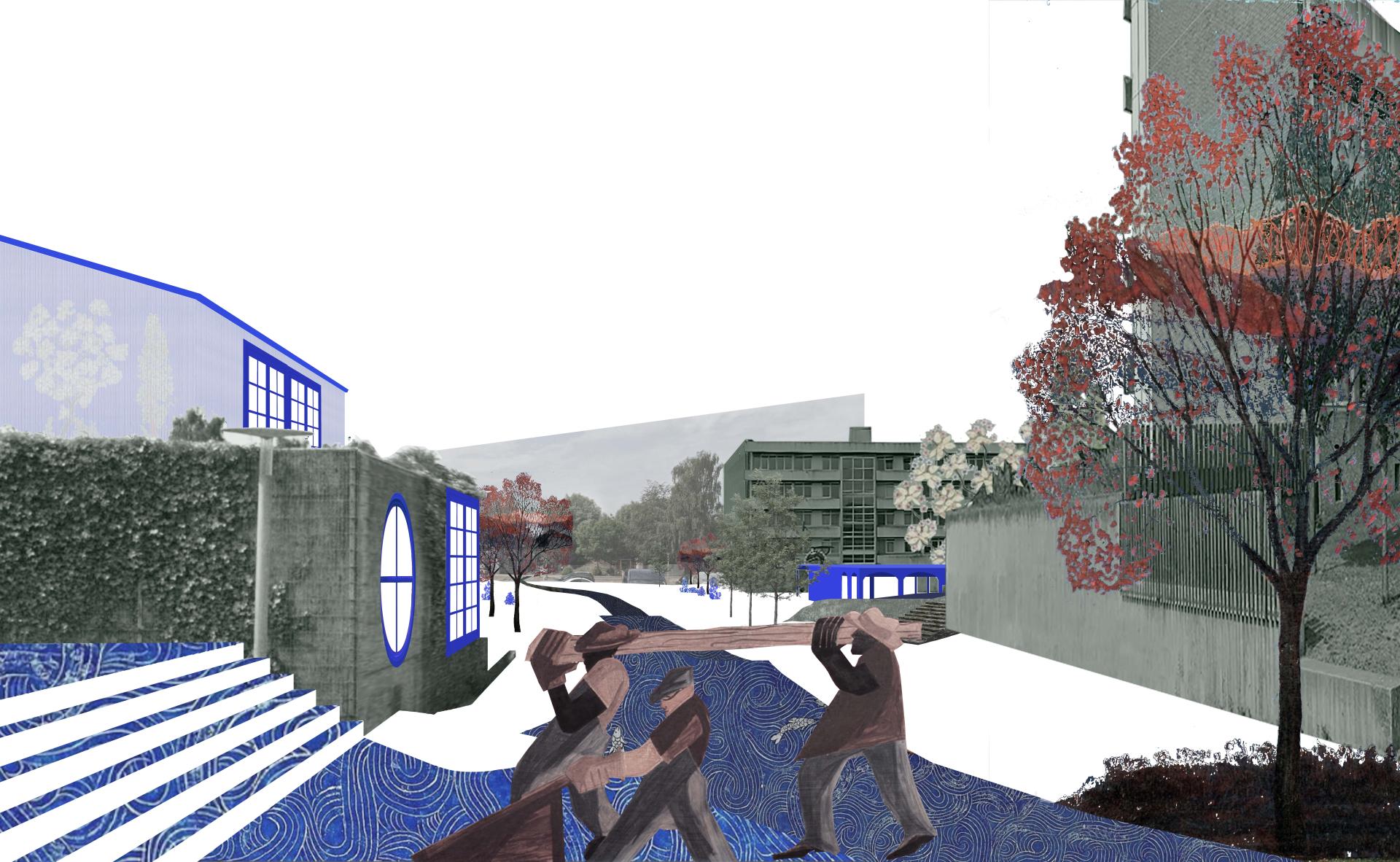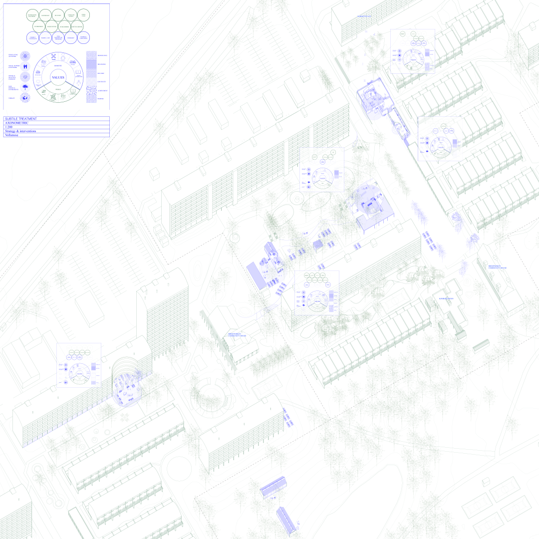 The project approaches this area as an already existing structure with possibilities for improvement. Based on trauma informed design and the neurological effects of space, in improving well-being and social interaction. The aim is to counter the spaces we conceive as “critical”. The modernistic car planned infrastructure, parking lots, asphalt pavement, concrete walls, garages, closed facades and corners creates an unwelcoming environment with a lack of visibility, and connection between segregated zones.