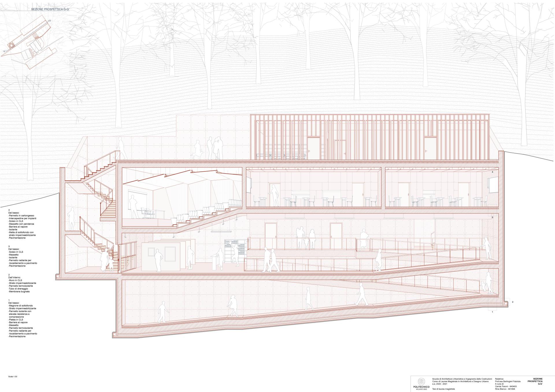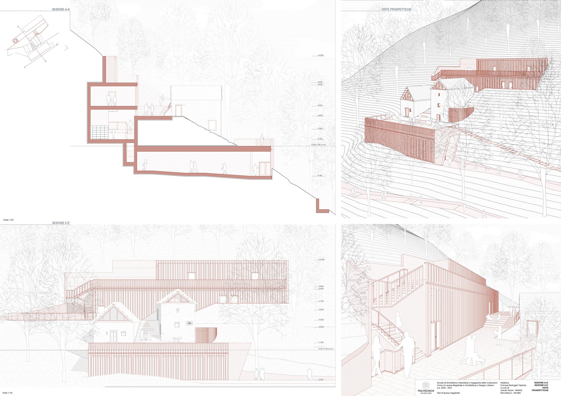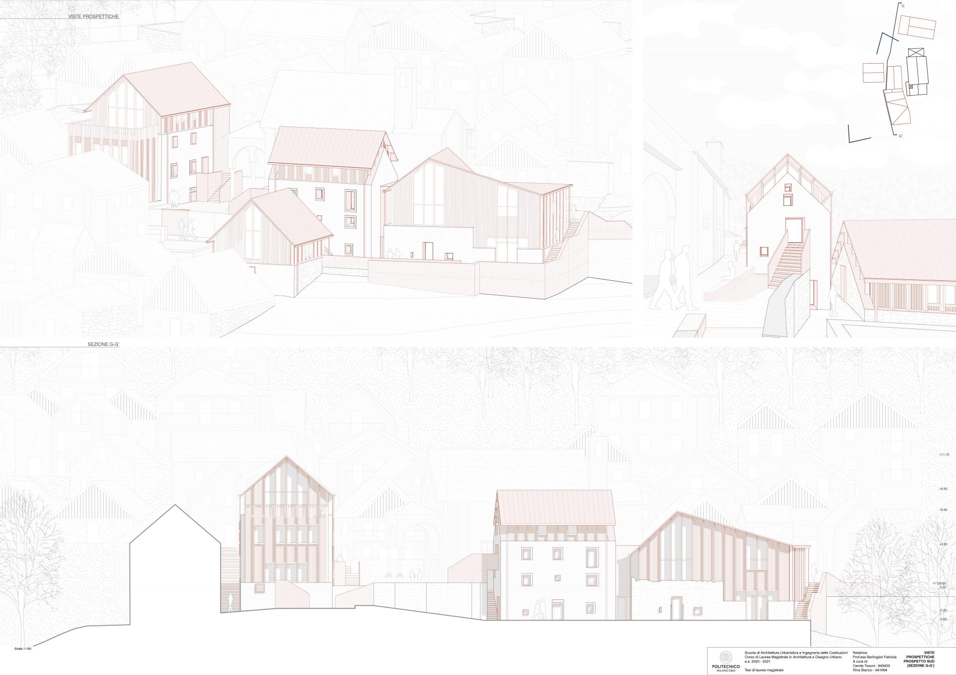 The aim of the project is to revive this valley deeply marked by the consequences of depopulation. The intent is to attract slow tourism, but also bring benefit to the few inhabitants who today are surrounded by abandoned structures and with insufficient places of vitality. The inhabitants could find the possibilities of job opportunities closely linked to the valorization and the conservation of the resources of the place into the agricultural life, the agritourism, the market, and in the management of the cultural center. In addition, these interventions are aimed to encourage the arrival of new people and the cultural center could become a meeting place. For this reason, small guest houses have been placed in Pizzanco next to common areas that can also be used by the locals. In addition, a house for the caretaker has been planned, seen as a figure that would help in the management of the place and that would then live the village in a lasting way. To make this possible, it is important to give attention to the accessibility of the place. For this reason, car parks along the route have been planned as well as an improvement of the road connection to make it accessible to public transport. Furthermore, specific attention has been paid to accessibility to the cultural center. The access is made possible to any type of users thanks to the inclusion of a parking lot along the road from which it’s possible to reach the panoramic lift and ramps that lead to high altitude.