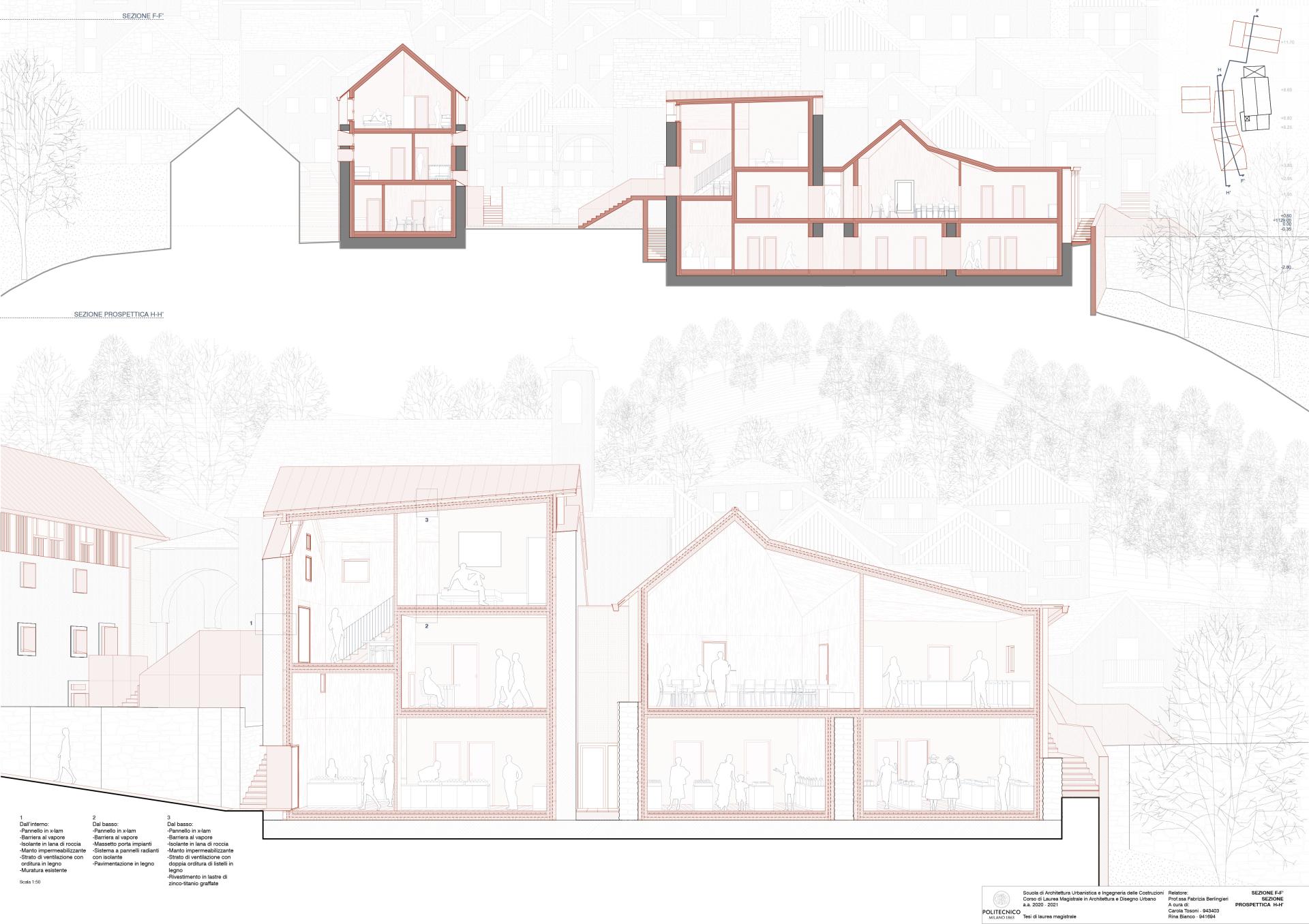 The project in these areas is aimed at the inclusion of these territories and the inhabitants of the valley within a development process that starts from local traditions and the enhancement of the historical and territorial heritage. It is a project that looks at the future and in line with this idea, the new buildings are designed with innovative and recognizable materials compared to the existing ones. In Pizzanco, wooden buildings are inserted within the existing walls, thus allowing energy efficiency. Wood is both a sustainable material and is consistent with the traditional materials of the place, even if re-proposed in an innovative way using xlam structures. In addition, wood has been approached with metal, which we find in roofing as a metal-seamed in titanium zinc allowing the coupling of solar panels.