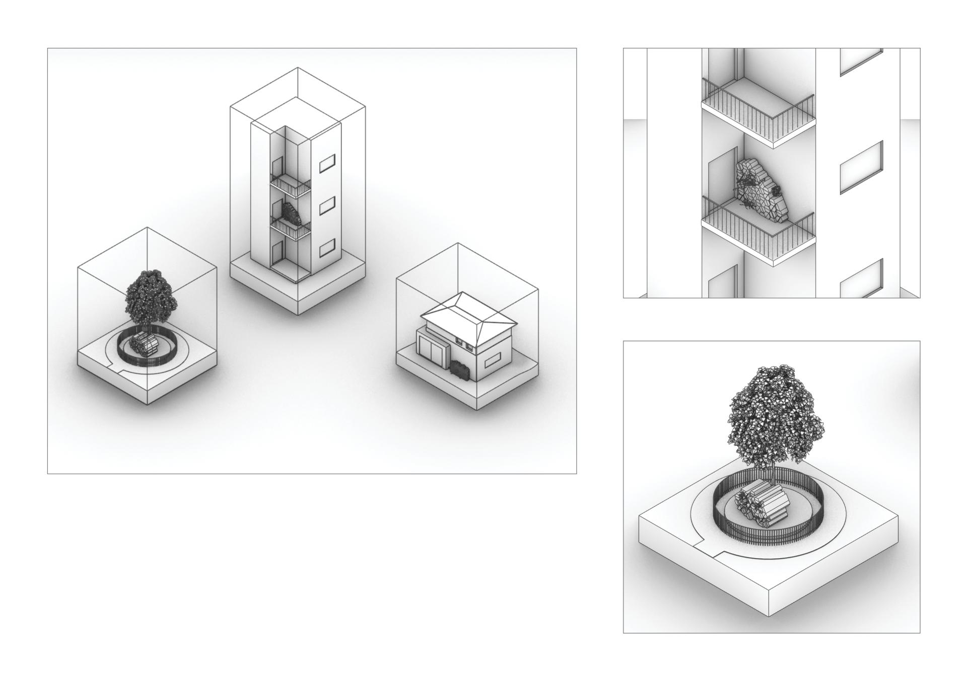 Finding the right shape has played an important role during this project, as the aesthetic impression of each structure plays a significant role when it comes to increasing the readiness of the public or an individual to integrate the proposal into their everyday life. An important part of the overall aesthetic impression results from stacking and arranging the modules. From front view, the modules are a tessellation, from a perspective point of view, the depth placement of the modules vary and create a dynamic spatiality, captivating to the eye.