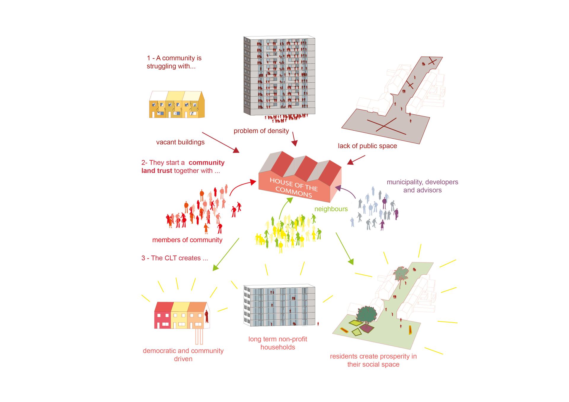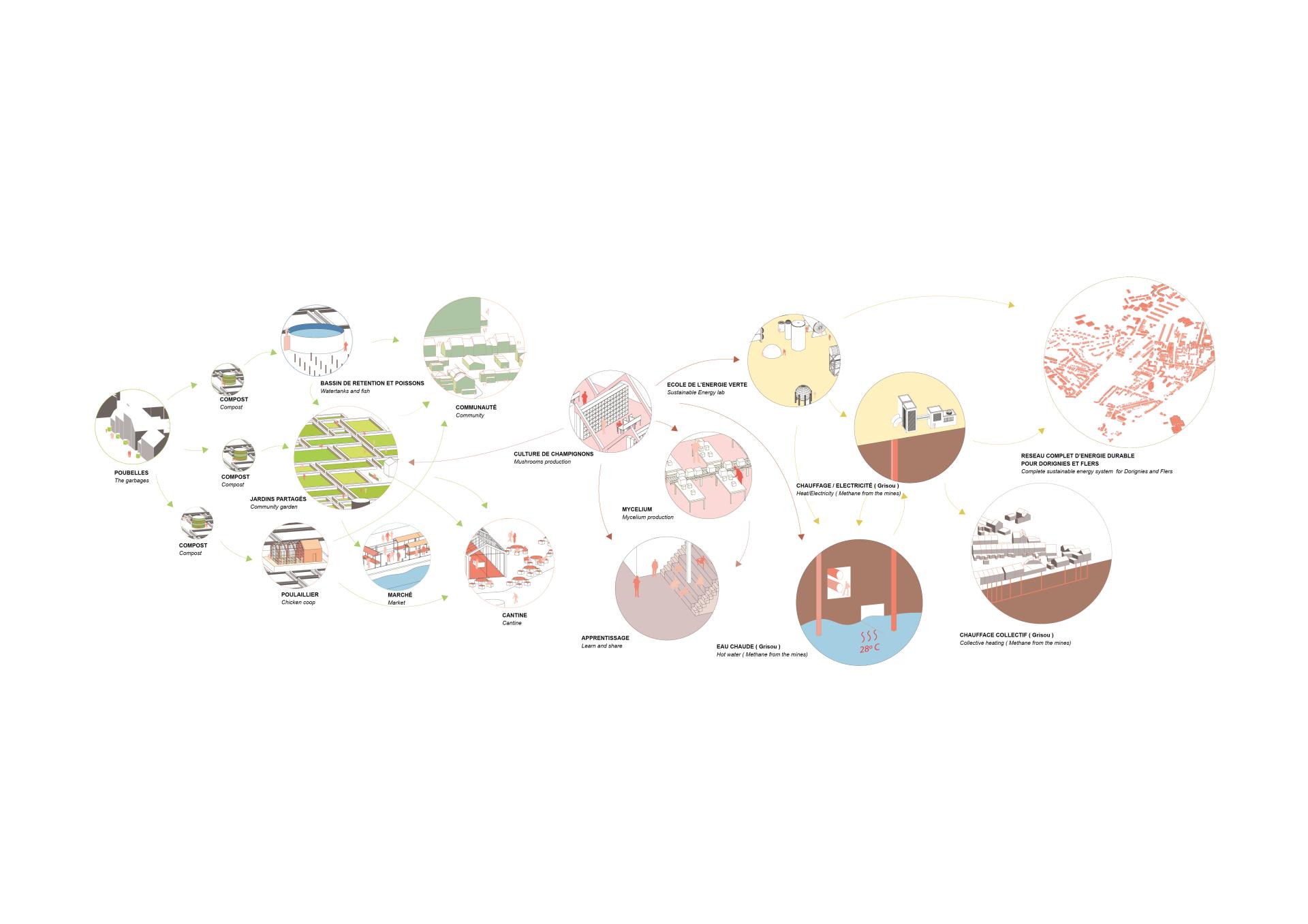The collective memory written by the mining past reveals existing social mechanisms based on a will-to-do and a capability to reinvent itself. Sharing, mutual aid, and social structure have been the core of the urban fabric of these mining districts. The closure of the mines has forced these territories to renew themselves and despite a national desire to regenerate an economy, these territories reveal a nostalgia and an immense need for revitalisation. What if the collective memory of mines was the ground for a new social economy? In this way, the mines wealth of the past will become the energy of tomorrow. Polluted land will be the site of new know-how and shared agriculture. The practical school will train professionals on circular know-how, inviting sustainable materials and energies. Dorignies and Flers will base their metabolism on a Community Land Trust in response to the old garden cities. The inhabitants will be the actors and the protectors of these possible spaces, where time and learning will be valued as much as generating economy. These new vitalities will be sources of sharing and social revitalisation.
