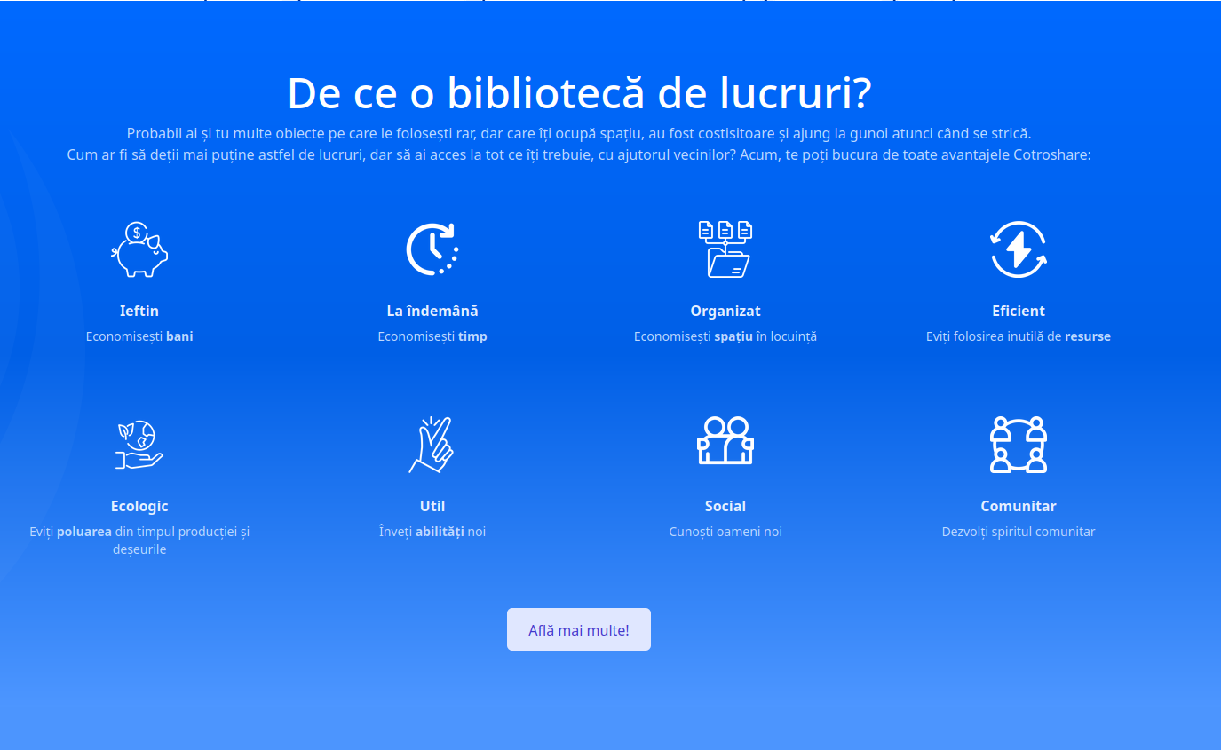 As the first library of things in Romania, Cotroshare aims to promote a circular and more collaborative economy. Using the online platform, and then the branded caravan, the members of the community will borrow and lend useful objects, saving money and time. The project will also become a learning hub where everyone can participate at social events, educative seminars regarding sustainability, free practical workshops, or interactive events for children.