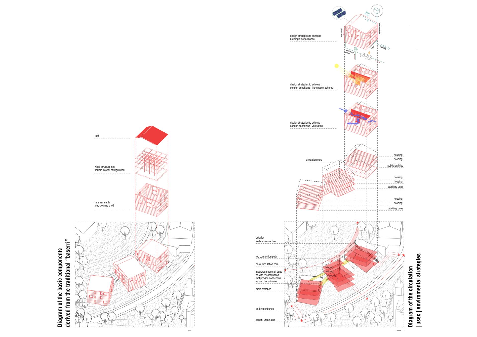 In approaching this particular topic, we tried to gain a fresh perspective, challenge the notion of ecology and the role of architecture, as well as introduce a new housing typology that can lead to a new architectural language. We employ a spatial vocabulary that stands in dialogue with the vernacular architecture of Beizama, while taking under consideration parameters such as social engagement and participation, alternative materiality, sustainability and self-sufficient energy solutions, as well as the unique character of the context and the nature as equal actors. That is why we paid close attention to designing a solution that is subject to the building regulations, both national and local, and made an effort to conduct a step by step plan of the implementation procedure.