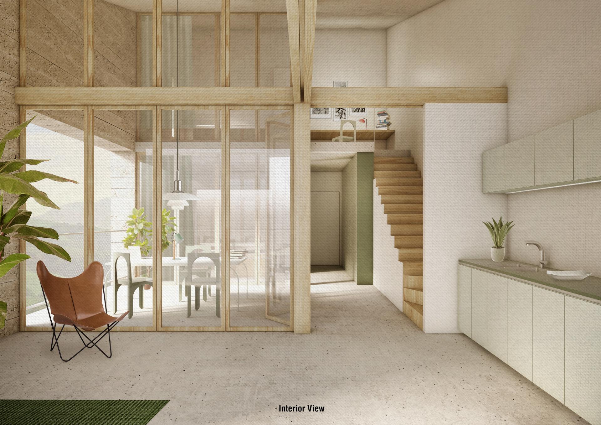 Regarding the building typology, the outcome that we wanted to achieve through this was a proposal that can correspond to various life scenarios and be open to transformations. Although each house corresponds to the same spatial qualities and in-between spaces, each of them can be expressed and formed in various ways depending on the users’ preferences. This plurality of living and productive spaces in coexistence with nature brings to the site a new model of cohabitation and where the interior and exterior defuse the collective unfolds. To achieve a mutual growth with nature, it is proposed an alternative construction system and affordable materiality that has a low extractive footprint. It is a basic design direction to reuse and reassemble as much as possible the local existing materials such as the earth and wood