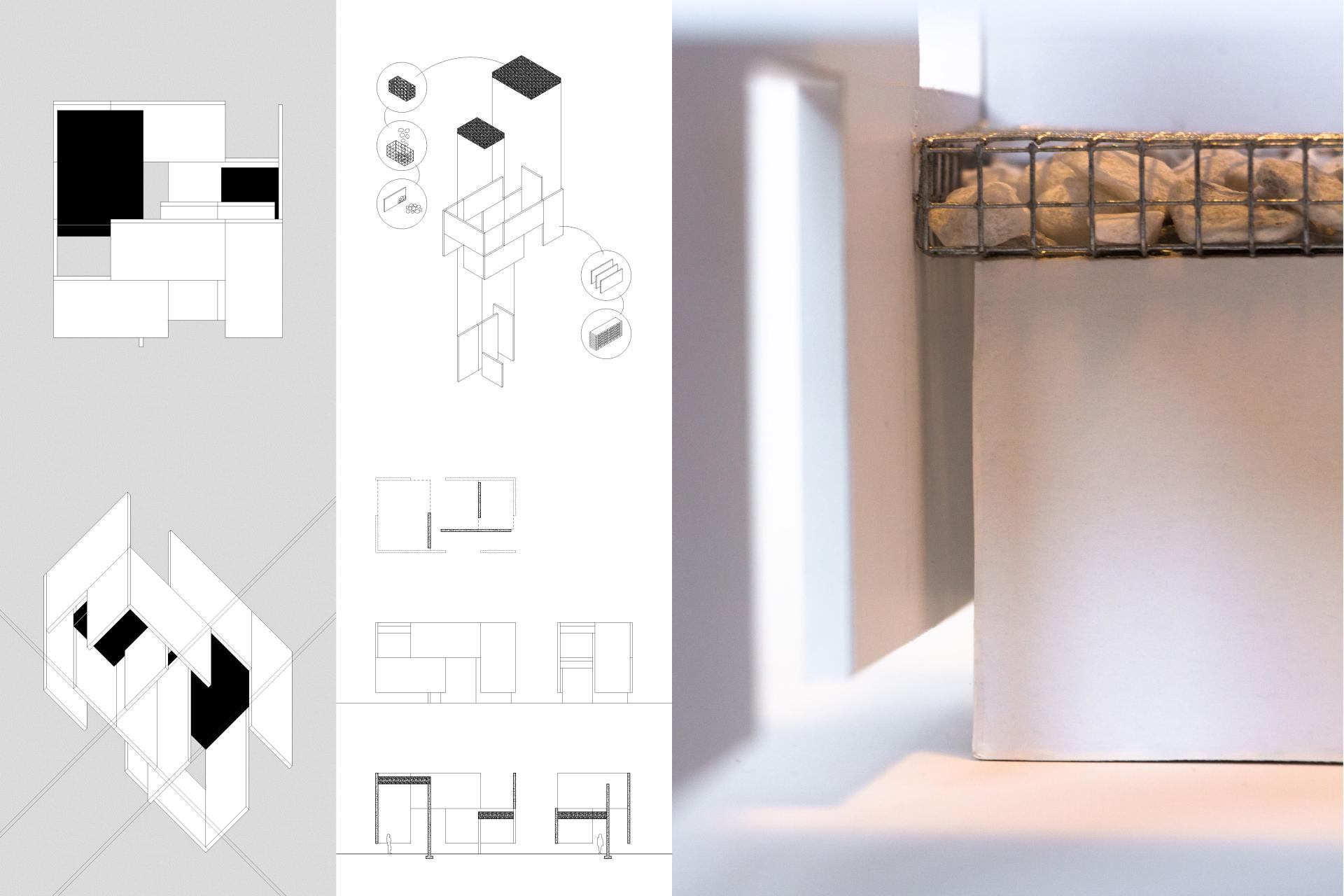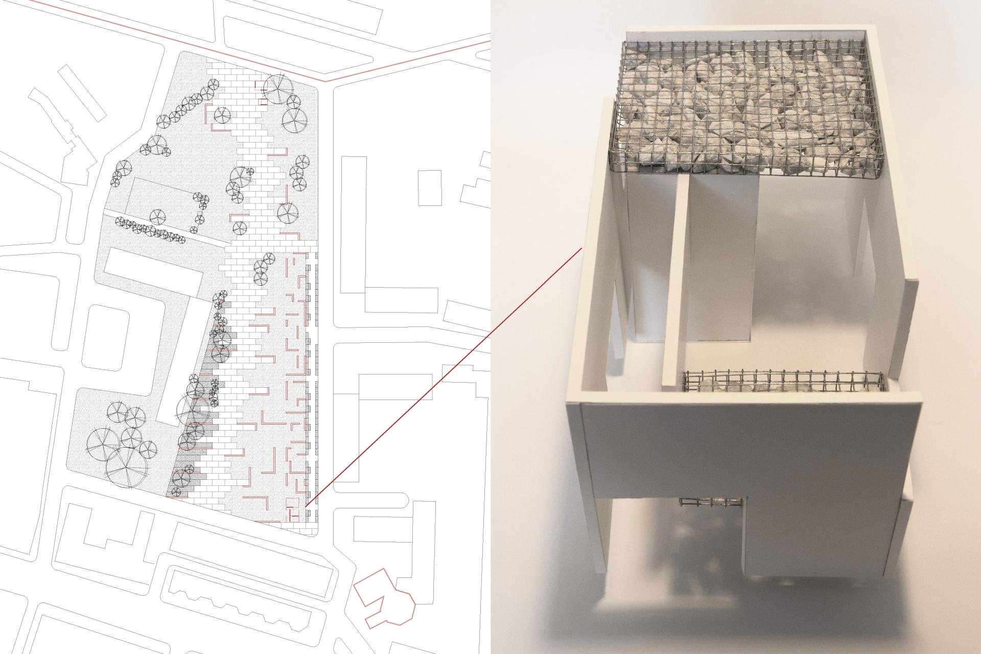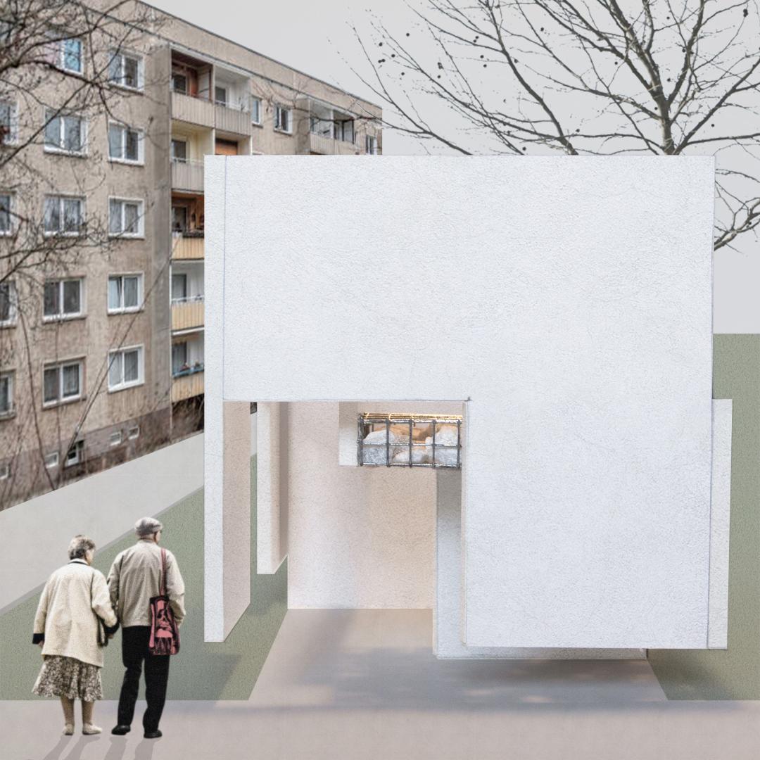 At either end of the park there are two small, yet tall pavilions, concrete panels seemingly floating off the ground. In the background sits a building made of these same panels, the plattenbau. Depending on the weather, the kiosk can appear like bright beacons, the concrete shining in the light, or rather austere, heavy panels floating close to the ground. Once inside, one realizes the structure is held together by gabions filled with crushed plattenbau. The structure holds traces of past and present.