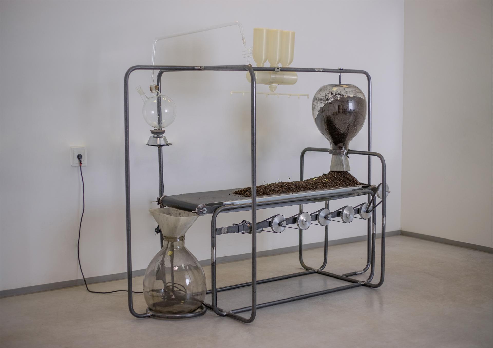 TerraPort consists of a construction part, watering system, conveyor belt and 2 glass silos on each side of the belt, filled with martian regolith. Materials used to build TerraPort are only those that one brings along the interplanetary voyage. I artistically involve myself in the project of humanity as an interplanetary civilization with literal use of my (female) body: by carefully collecting and studying everything my body drops away as superfluous. With those I fill the containers in watering system from which the artificial circadian rhythm, built into the robot-machine, waters and fertilizes martian regolith. Below it, a conveyor belt filled with regolith moves 5cm/day. Regolith travels from one glass silo to another for exactly 30 days, which is the time frame for the soy to germinate, grow a long shoot (internode) and eventually dries out. After these 30 days, when the life cycle of soy is completed, the soil gets more and more filled with organic matter, dried soy and body debris, along microorganisms that spontaneously grow on rotting soybean stalks. Observing the path and time frame of conveyor belt is like observing a plant grow.