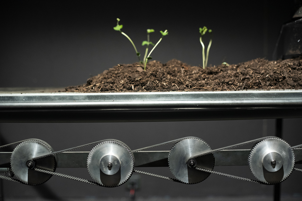 max) which I choose as a model organism. Terraforming is taking place in the cycles of sprouting, growing, and dying of soy plant that takes one month which is exactly the time that conveyer belt travels from silo to silo, that are flipped at the end of each cycle. The regolith in the TerraPort installation is artificially composed according to the data collected