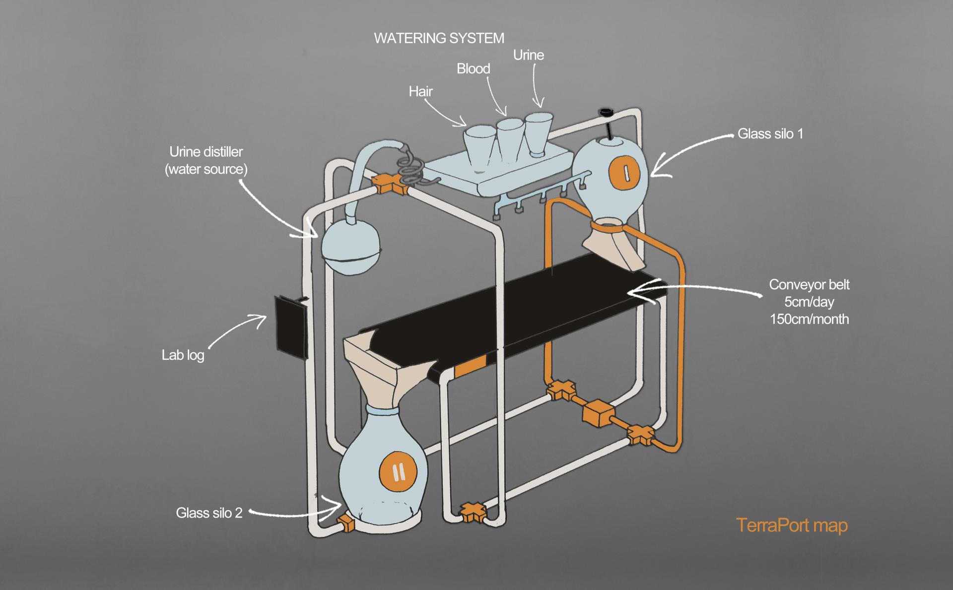 TerraPort is the attempt to bring forward challenges of the Anthropocene where harmful human activity on planet Earth should stop by changing the production mechanisms driven by contemporary neoliberal capitalism. This machine aims to raise awareness among those who interact with it to experience the scale of time and resources, necessary to repair something we usually take for granted. TerraPort refers to sustainability in a sense, that it deals with materials that we usually dismiss them on Earth as irrelevant, but on a planet Mars where we find only anorganic substances, these are key materials as they can help to turn martian regolith into a fertile soil and grow crops of eventually various plant in it. By the gesture of donating my body material and fluids into the regolith the process terraforming is triggered. Through the act of constant influx of human body materials and fluids a radical care for other nonhuman agents is communicated.