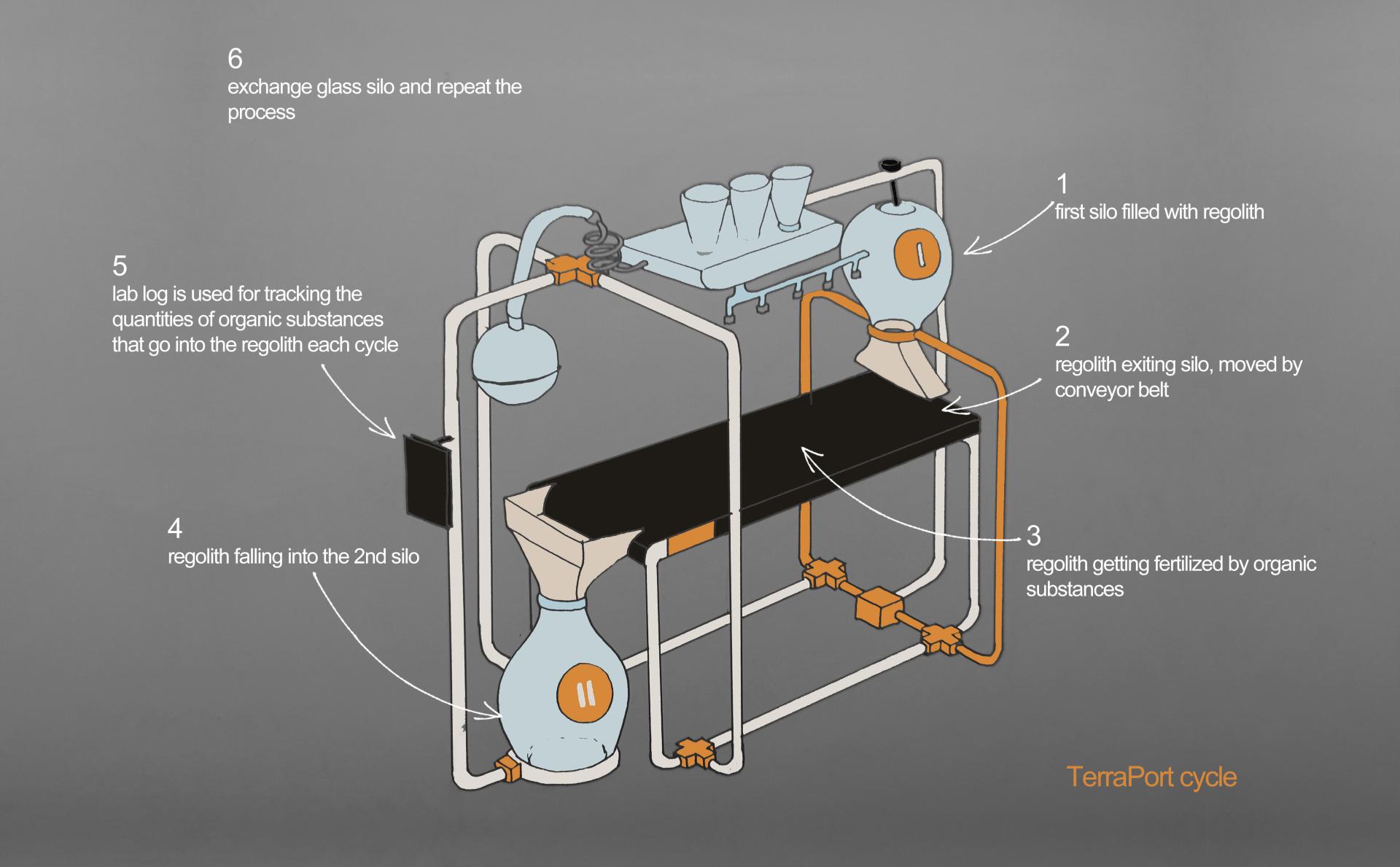 The project stems from the human desire for interplanetary travel and initializing life on an uninhabited cosmic body by terraforming it with the help of frugal waste management. TerraPort is speculative, but the fully functional machine, that turns a regolith with no