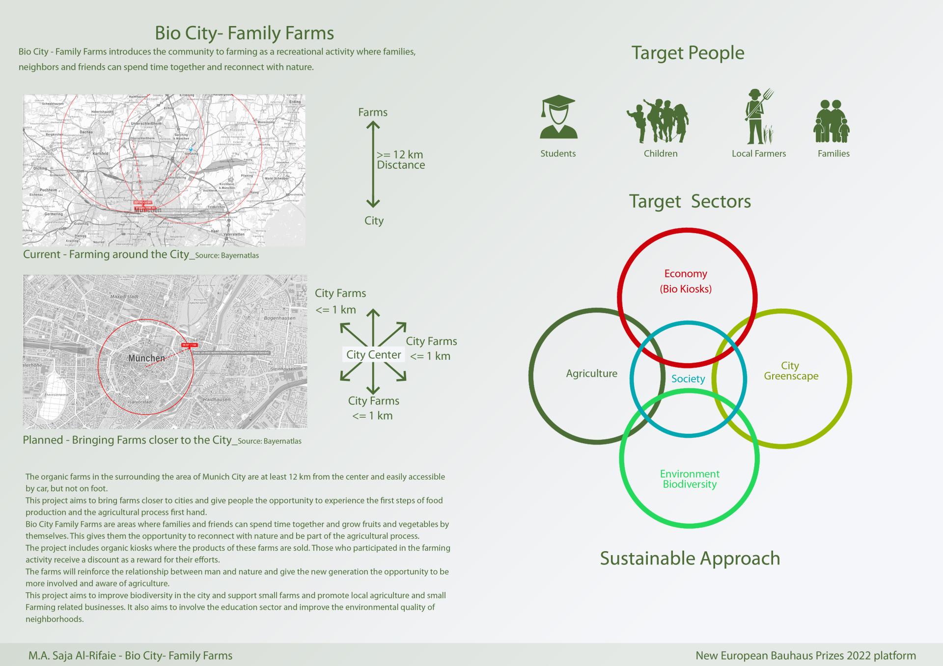 The organic farms in the surrounding the area of Munich City are at least 12 km from the center and easily accessible by car, but not on foot. This project aims to bring farms closer to cities and give people the opportunity to experience the first steps of food production and the agricultural process first hand. Bio City Family Farms are areas where families and friends can spend time together and grow fruits and vegetables by themselves. This gives them the opportunity to reconnect with nature and be part of the agricultural process.