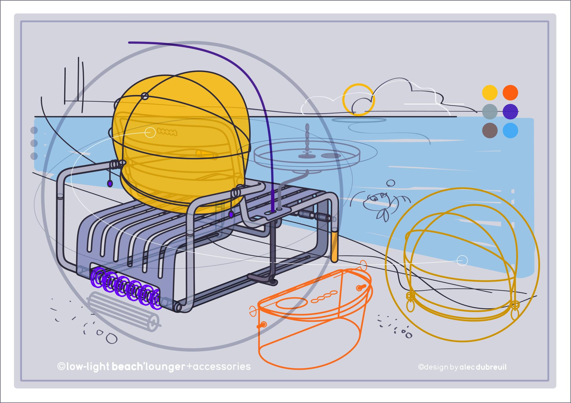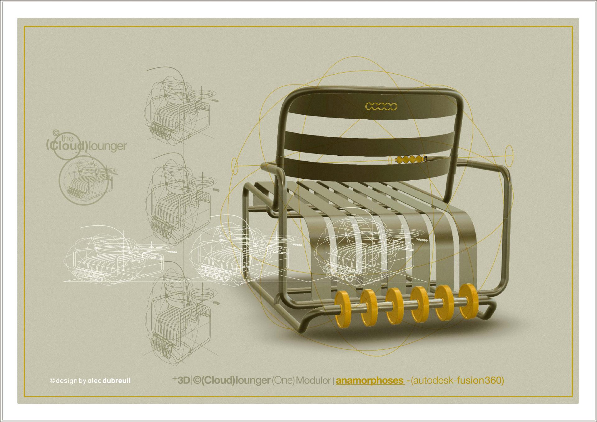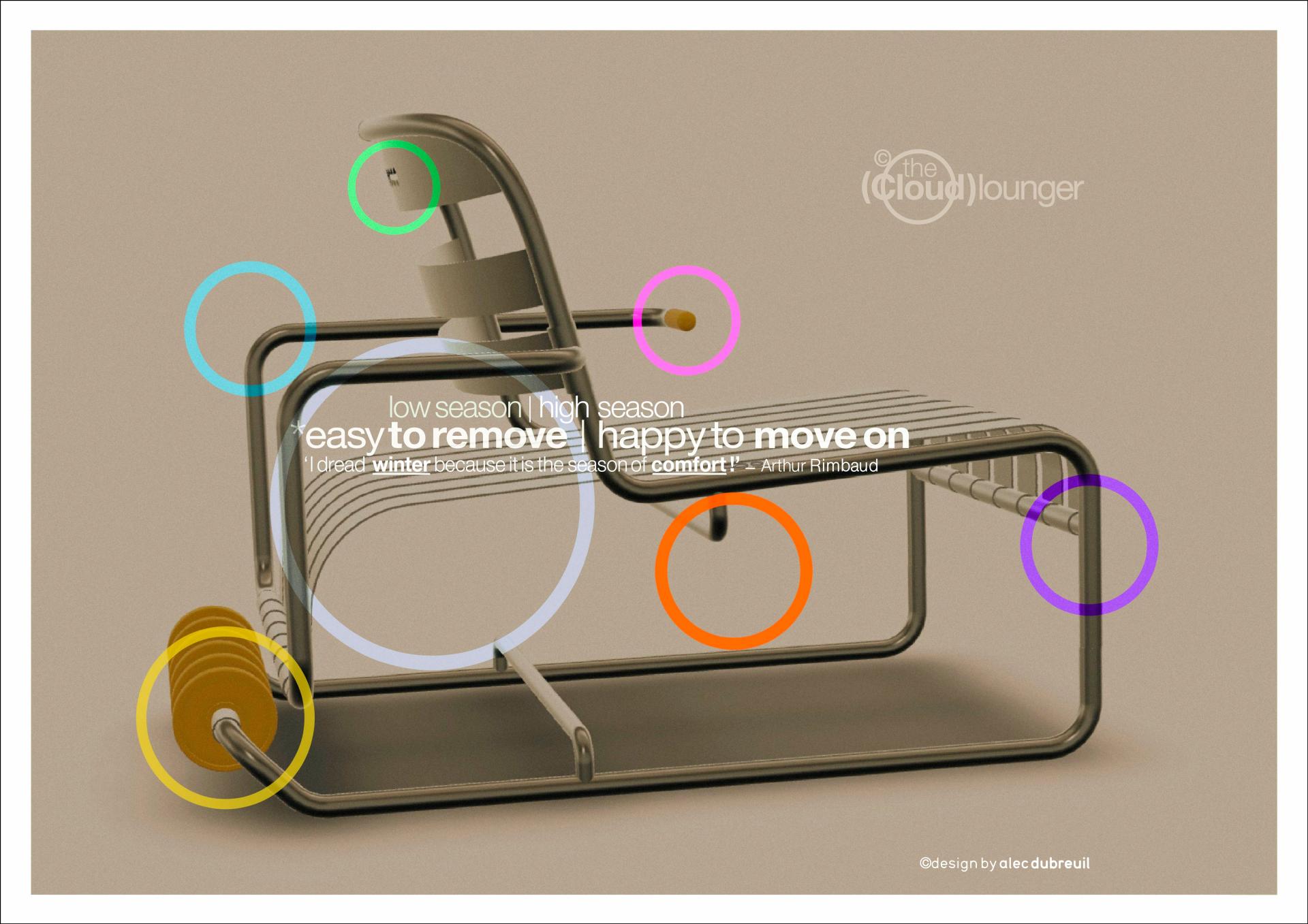 The Enjoyment Zone is the subject I am interested to explore in depth : a type of chair that is absolutely useful outdoors as well as aesthetically pleasing to look at when outside, wheiter it is occupied or unoccupied. An object of work and one of well-being (without excluding there being pleasure in work) practically a nest on a cloud, a platform in itself providing easy access to knowledge, while an ideal spot for a break, a place to chill out, to cool your mind. A life-size chair, almost tailor made (a chair with a view), well dressed, well adapted ready-made, exposed to a broad perspective ; at the same time suitable for contemplation and for thinking differently, the needs and desires for connections to the social networks community as to interactive family ties, (away from the crowd), a private network within one’s circle, surfing quietly and cosily over the unbearable lightness of being ; how to make the activity of work fit within expectations of one’s private life. — that’s the whole essence of the (Cloud)lounger project, a chair that is a double of the self.