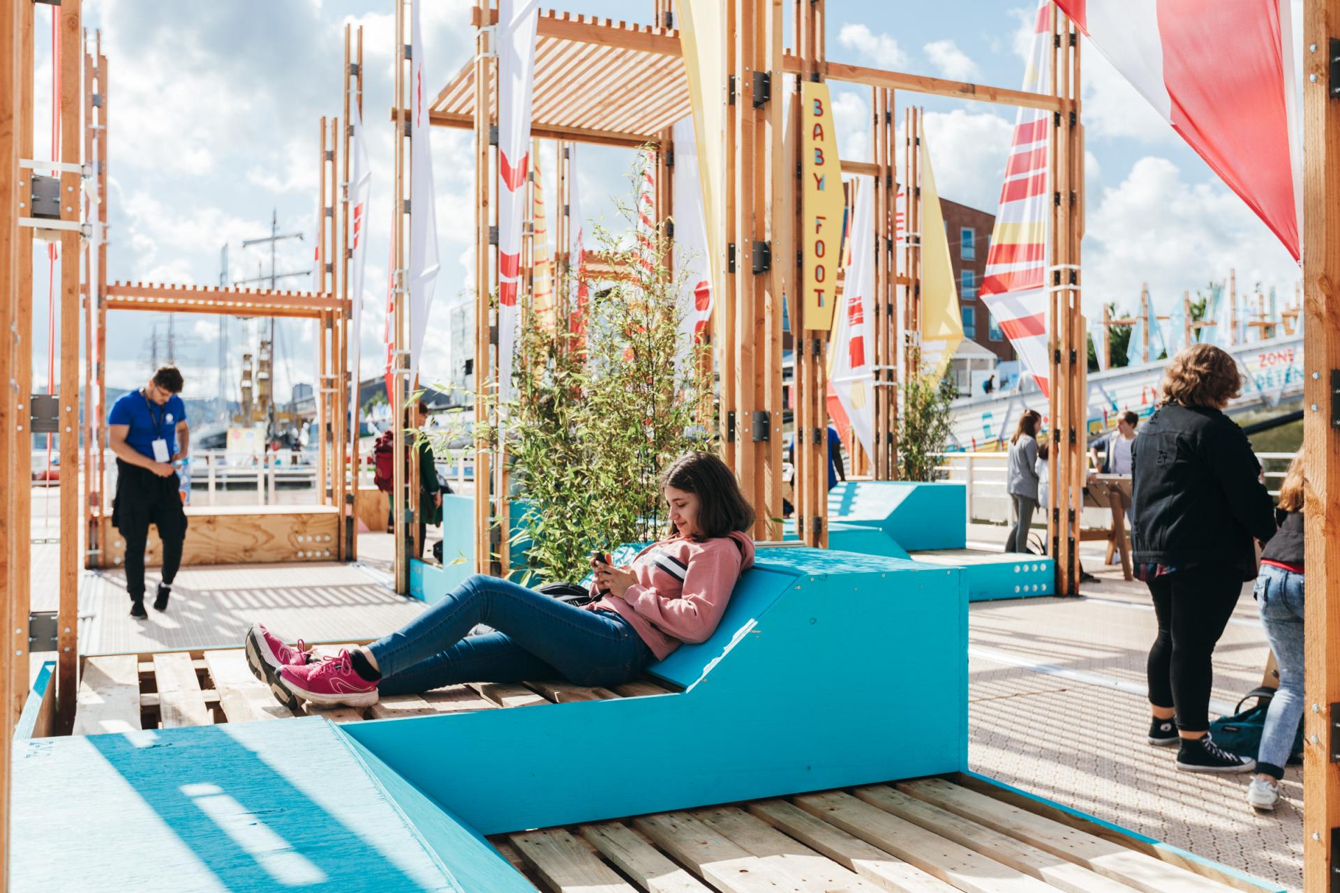Colorful furniture are set at the foot of each mast. Their evoluting shapes brings different uses: deckchairs, benches, tables, lounge areas, bleachers and a stage; the public can freely appropriate each space.