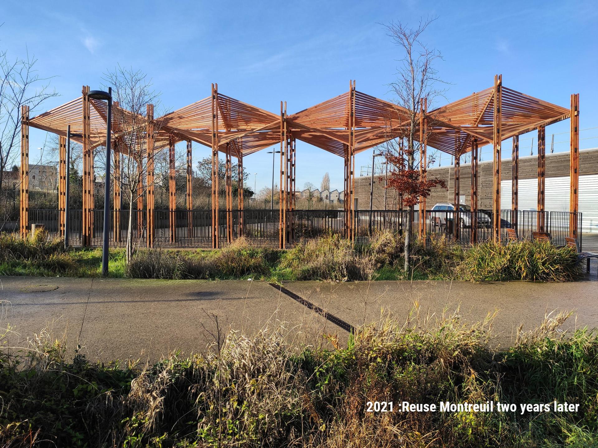 This event took place in 2019. We have since reused the wooden poles on two other events. In 2020, the structure was redesigned for an outdoor cinema in the Fort of Aubervilliers. Then in 2021, we were able to adapt it to the forecourt of the municipal swimming pool in Montreuil in order to bring freshness with misters and shade over the summer period. We are currently in discussions with the Parisian festival We Love Green to adapt the structure for a foodcourt space in the middle of the forest for 2022.