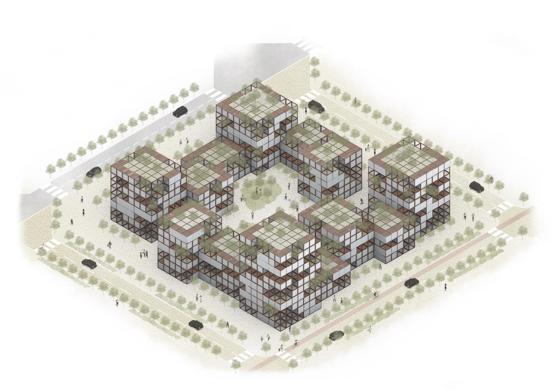 Currently Josep Pla street is quite crowded in some areas and little in others, so it is proposed to pave this street completely while keeping a minimum number of car lanes so as not to affect traffic in the area as much. In this way, cars are forced to find an alternative route to this and the use of bicycles and buses is promoted. In the area where this project is focused, the minimum number of lanes left for road traffic is two one-way lanes, accompanied by a bicycle path. Street paving also affects public spaces adjacent to the street and the land designated for this project. In this way a mesh is created that attracts pedestrians to follow the route, finding different experiences along the way. Public space is essential for this project, that is why the green corridor is endowed with lush and local vegetation. In addition, in the land that has been destined for building, the desire to have a large public space remains, with green areas around the buildings and even with a large park at the intersection of Calle Josep Pla with the historical axis of Pere IV. In this way, the green remains from the beginning in the Sagrera until it reaches the sea. To facilitate the construction and location of the buildings, a 3x3x3 meter wooden modular base has been used, with which one plays until reaching the final result, several buildings of different heights and shapes, but always having a base structure. On the terraces of each building, there is a green roof so that in this way the space occupied by the buildings can be recovered on the roofs of each one. All buildings contain vertical porches and gardens to create a game between public and private space.