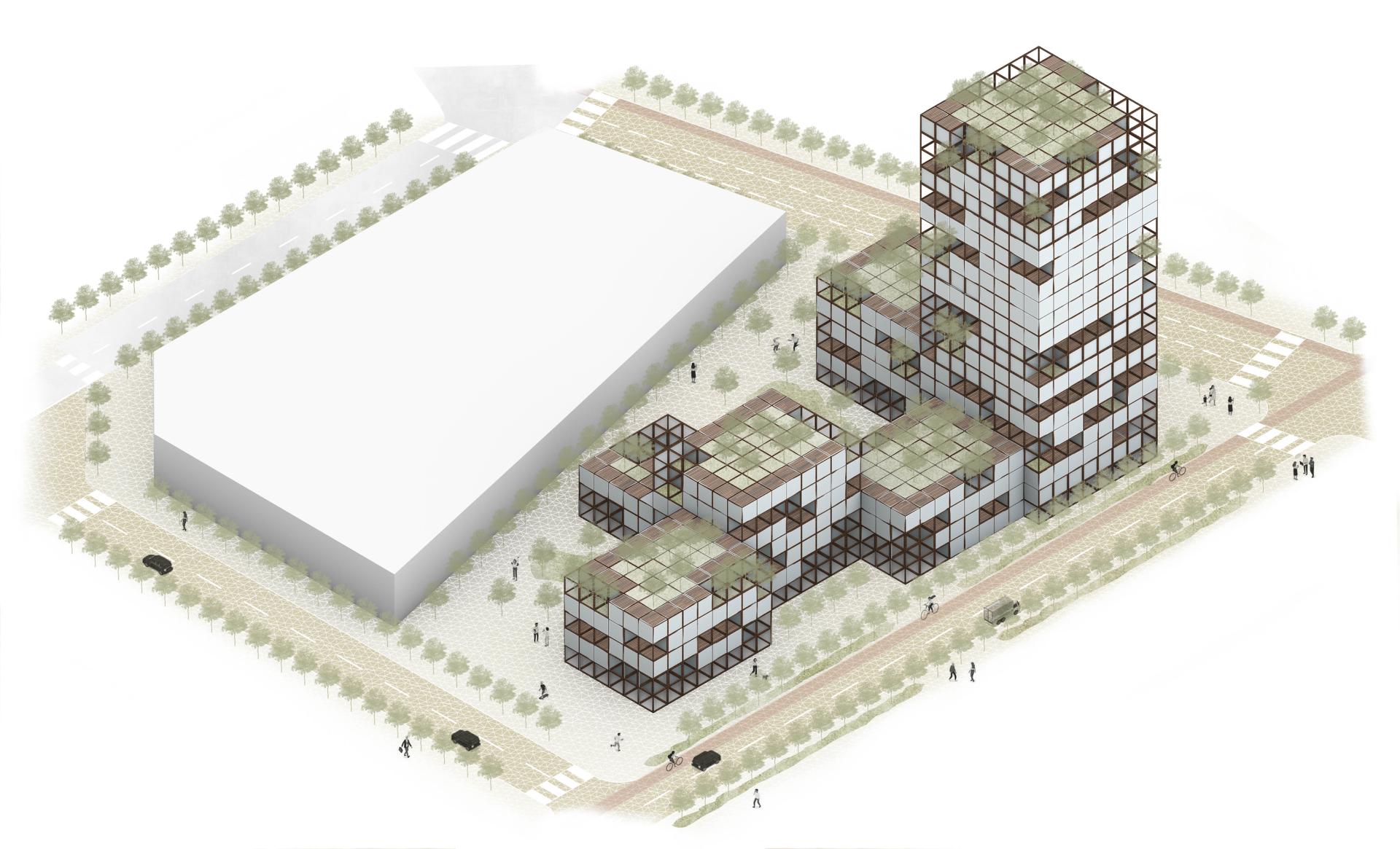 Currently Josep Pla street is quite crowded in some areas and little in others, so it is proposed to pave this street completely while keeping a minimum number of car lanes so as not to affect traffic in the area as much. In this way, cars are forced to find an alternative route to this and the use of bicycles and buses is promoted. In the area where this project is focused, the minimum number of lanes left for road traffic is two one-way lanes, accompanied by a bicycle path. Street paving also affects public spaces adjacent to the street and the land designated for this project. In this way a mesh is created that attracts pedestrians to follow the route, finding different experiences along the way. Public space is essential for this project, that is why the green corridor is endowed with lush and local vegetation. In addition, in the land that has been destined for building, the desire to have a large public space remains, with green areas around the buildings and even with a large park at the intersection of Calle Josep Pla with the historical axis of Pere IV. In this way, the green remains from the beginning in the Sagrera until it reaches the sea. To facilitate the construction and location of the buildings, a 3x3x3 meter wooden modular base has been used, with which one plays until reaching the final result, several buildings of different heights and shapes, but always having a base structure. On the terraces of each building, there is a green roof so that in this way the space occupied by the buildings can be recovered on the roofs of each one. All buildings contain vertical porches and gardens to create a game between public and private space.