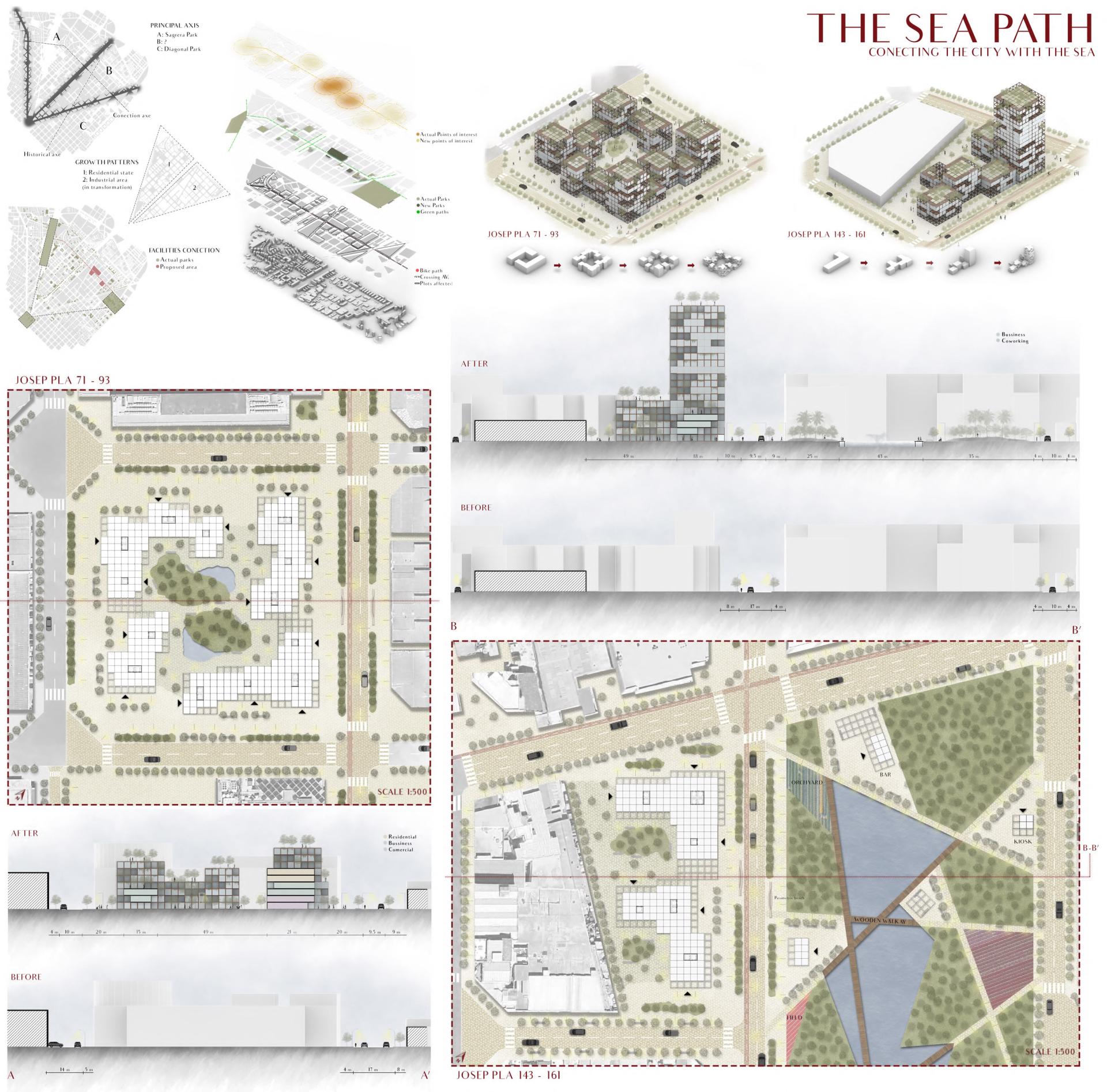 The Sant Martí district has been characterized in recent years as being the focus of most of the city's urban renewal. This district is relatively new since prior to the 70s, there were practically no homes and most of it was an industrial area. From these events, urban renovations such as the Forum, Glòries or the most influential long-term project of Sant Martí, 22 @, began to be considered. The purpose of this project is to attract the financial and business sector, thus renovating the industrial area and in turn maintaining the architectural heritage. 22 @ has been projected throughout the district in recent years, with the Plaza de las Glorias being its focus. However, for the near future, there are also other projects planned such as the new park of glories and the great park of la Sagrera, which includes the new AVE station. The purpose of The Sea Path project is to rethink the focus of renewal in the area, adding a new one, apart from those proposed as glories and the Sagrera, and the existing diagonal sea. This new focus located in one of the most neglected areas of the district, would not only become a commercial, cultural and leisure landmark but would serve to connect the central station of La Sagrera, with the sea, from a green corridor, the Josep Pla street. In this way, it revalues the area and encourages investment in it. One of the disadvantages of 22 @ is that the land used for this purpose has a purely business use, so that the life of the place is lost when it is not working time. For this reason, the projects attached to the green corridor give tension to the area by creating multipurpose spaces, so that it not only serves as a business area but also so that it becomes a residential, commercial and leisure space, in order to create a metropolitan-scale activity centre.