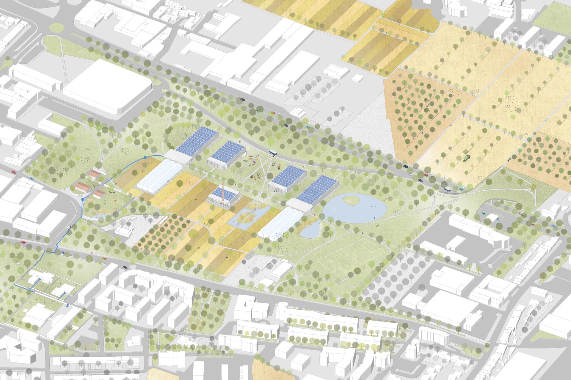 Meanwhile, the urban landscape would be regenerated. Abandoned farmhouses nearby the Zone 1 would turn into educational farms to host both school students for laboratories on environment and nutrition, but also young interns of the farms. On the other hand, several abandoned factories would be restored and turn into vertical farms to integrate the food production within the city and start a research program on indoor cultivations spread all around the city. By doing so, the entire degraded areas around these buildings would be revitalised and equipped in order to provide people better places where to stay or just pass by.