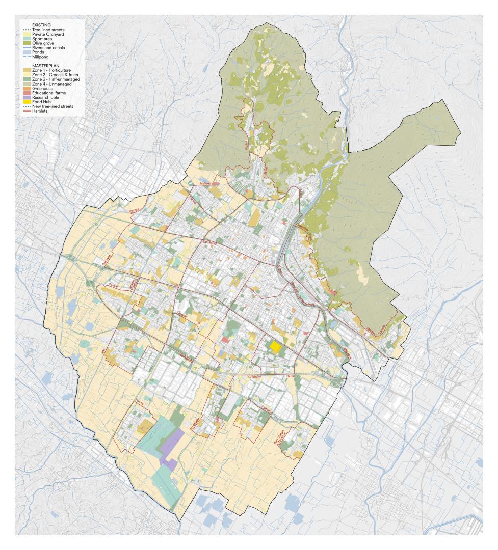 Prato is a medium sized city characterised by a polycentric urban structure. The central core is surrounded by many hamlets that merge with the outer agricultural belt. The result is a city with inner agricultural islands, cultivated with wheat, following an industrial approach in a long supply chain strategy. Nevertheless, these open areas still ensure the inhabitants fundamental ecosystem services, such as pollution and heat islands mitigation. According to agroecology, these can be enhanced by diversifying the cultivations, introducing horticulture crops and using natural treatments. This will also improve biodiversity and provide more local fresh food to the citizens.