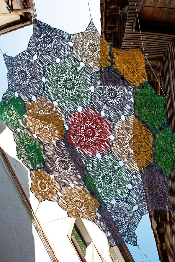 Tejiendo la calle is a cooperative project. It consists of using “XXL crochet” to create light structures as sunshades, wich are hung througout the streets of Valverde de La Vera (Cáceres, Extremadura, Spain) during the summer. The installation is an expression of the town´s identity and cultural heritage as well as an embodiment of the intentions and desires of the people who participate in the project. The light structures welcome visitors to the town and help to create a festive atmosphere. They shade people from the sun during the day and show the way to the town´s central square, wich is the main meeting point for people attending the town´s festivities.