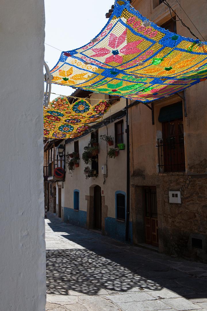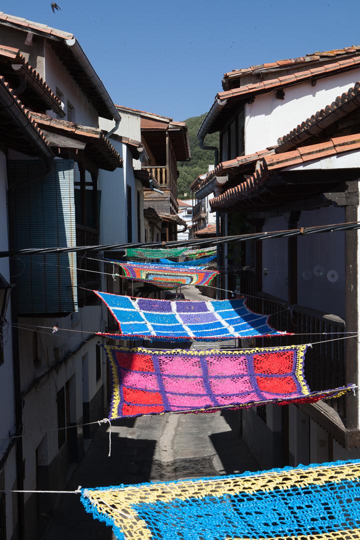 Tejiendo la calle is a cooperative project. It consists of using “XXL crochet” to create light structures as sunshades, wich are hung througout the streets of Valverde de La Vera (Cáceres, Extremadura, Spain) during the summer. The spatial art installation is an expression of the town´s identity and cultural heritage as well as an embodiment of the intentions and desires of the people who participate in the project. The light structures welcome visitors to the town and help to create a festive atmosphere. They shade people from the sun during the day and show the way to the town´s central square, wich is the main meeting point for people attending the town´s festivities.