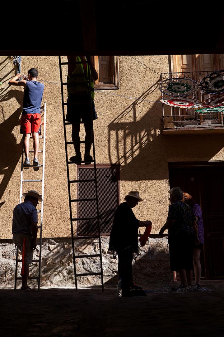 Tejiendo la calle is space for cooperation in a rural community. It transforms the streets of the town with light weaved structures as sunshades. The project is done mostly by eldery women who retain and share textile crafts that are being lost. They reuse plastics to crochet the pieces. They generates shadows for the summer with an atmosphere of celebration. They show their affections, wishes and memories. They change every year, and hangs like the clothes between the balconies of the houses.