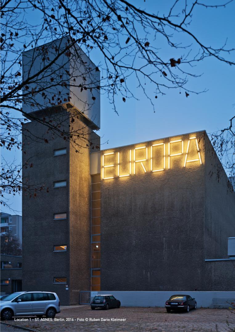 EUROPA was first installed in November 2016 at the Königgalerie / St.Agnes in Berlin and moved after half a year to the stage tower of the Komische Oper at Unter den Linden. Within the course of four years the project was brought to twelve different locations so far. During the summer 2017 the sign was shining for the Ruhrtriennale at the Jahrhunderthalle in Bochum. Then, the UNESCO world heritage Zeche Zollverein offered a perfect location: being part of the European cultural heritage year 2018, the EUROPA light installation reached in Essen the roots of the European community and reminded of its historical aspects in the last year of coal production in North Rhine Westphalia.