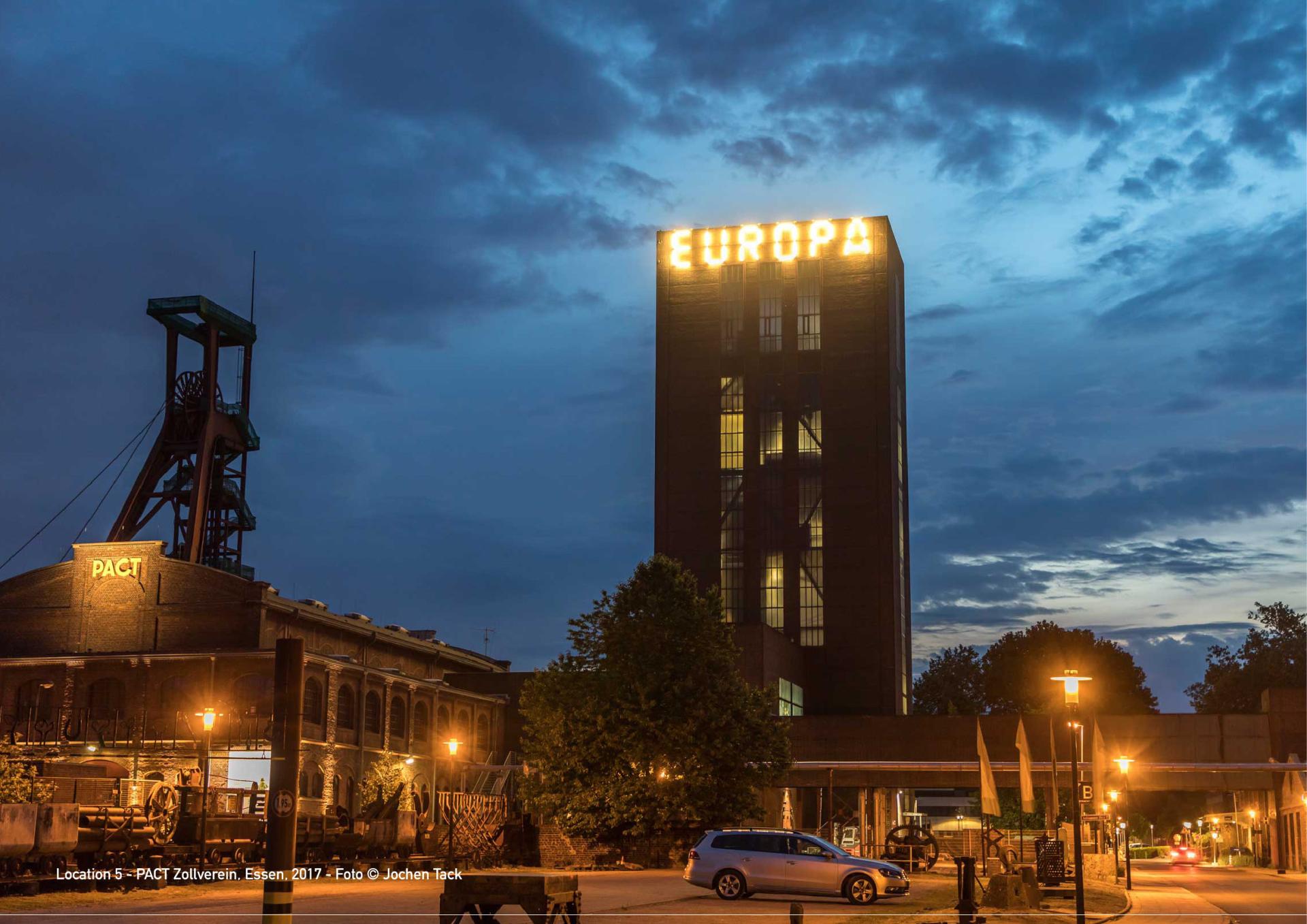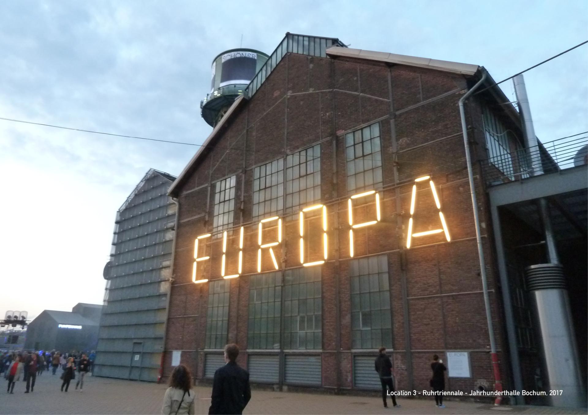 In the beginning of the project it was not foreseen, but during the course of the process - that will be described later - it came as no surprise that half of the locations of EUROPA are postindustrial buildings, such as the large structures of the former coal mines in Bochum, Essen and Duisburg. They fit to the EUROPA lettering not only in an esthetic sense. The historical aspect of the roots of the EU in the Ruhr area had already been mentioned.