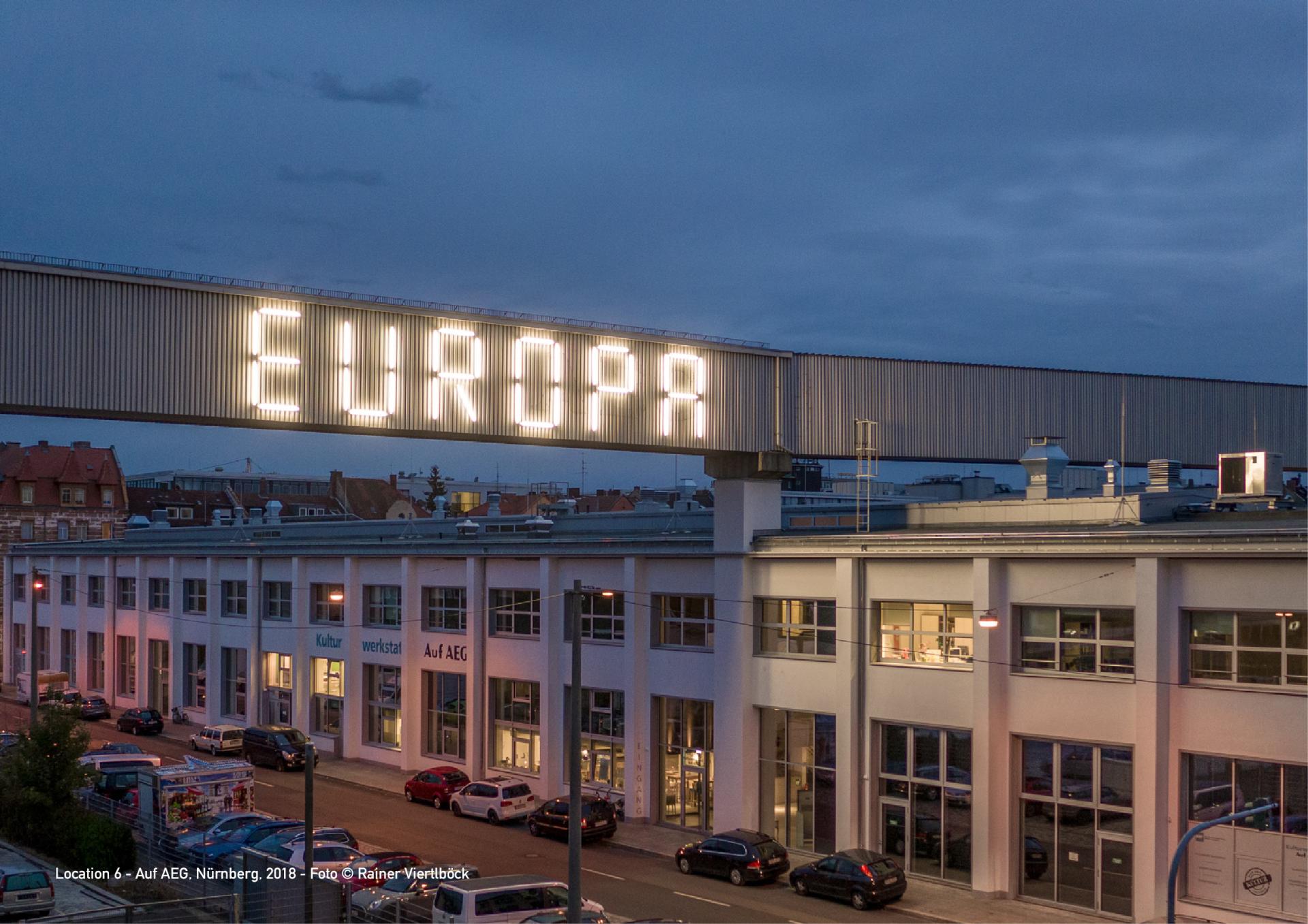 But also the well-known electrical manufacturer AEG with its former headquarters in Nürnberg or the abandoned powerplant in Hamburg ‘Kraftwerk Bille’ and the converted production plant for textile looms in ‘Wirkbau’ Chemnitz are industrial sites that were refurbished and are now being reused, serving as a strong backgrounds for the EUROPA sign.