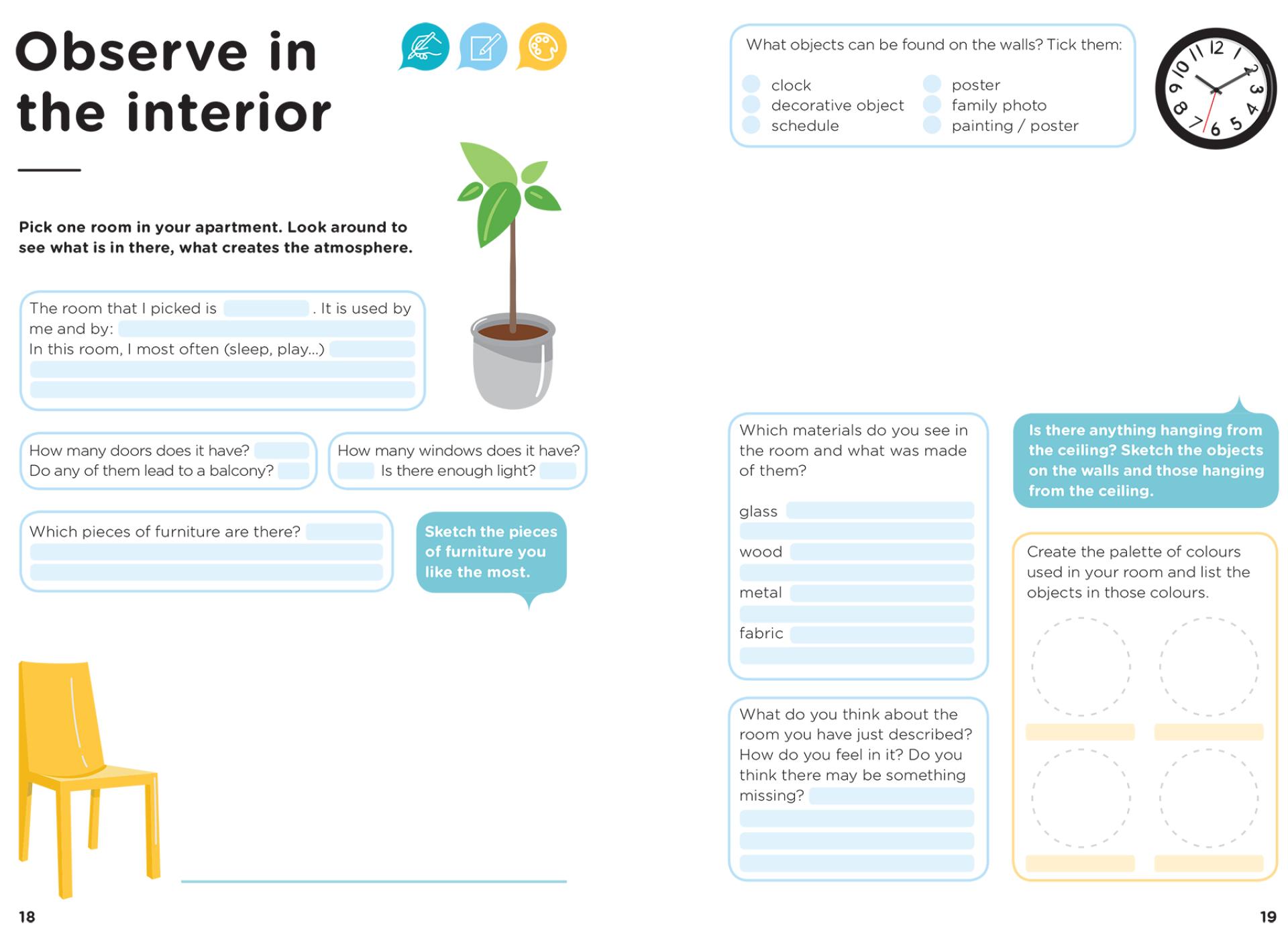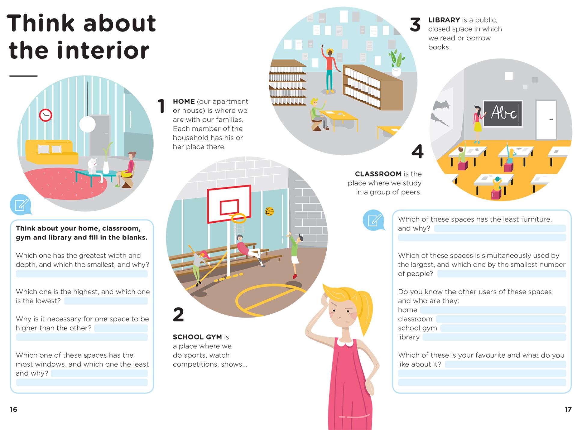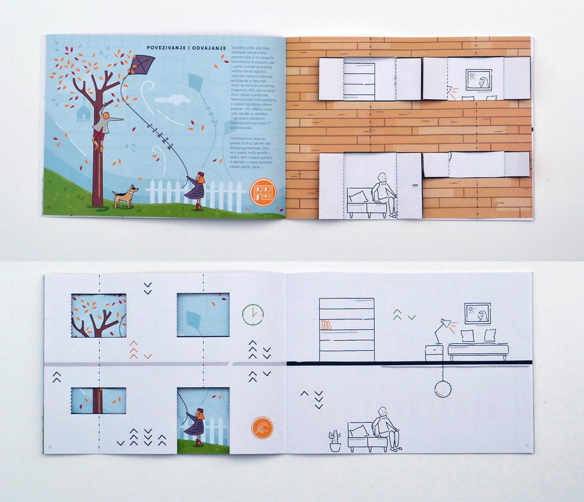 The material in the first handbook is divided into three topics: an introductory topic whose goal is to make children aware of the concept of scale, especially man as the measure of the built space, and two main topics: interior and exterior, as two parts of the space that surrounds us. The material in the second handbook focuses on building facade as a two-faced layer that impacts both the interior and the exterior.