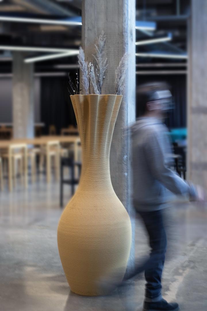 Large-scale additive manufacturing plays out its advantage with big and fat extrusions, which aim to accelerate the process cycle and keep the duration at a minimum. This is achieved with large extruder nozzle diameters and high throughput of material. Obviously this happens on cost of fine details, but those thick layer lines also represent a distinctive feature of this manufacturing method. It's like the known saying, if you can't hide it, decorate it. For us, those thick layers are the new style of modern plastics. Combined with the lively tone of shredded plastic waste of the same color, but different source, and the possibility to create color gradients by mixing different colors, this manufacturing method offers an absolute unique way of creating something beautifully organic out of the embodiment of synthetic - plastic.