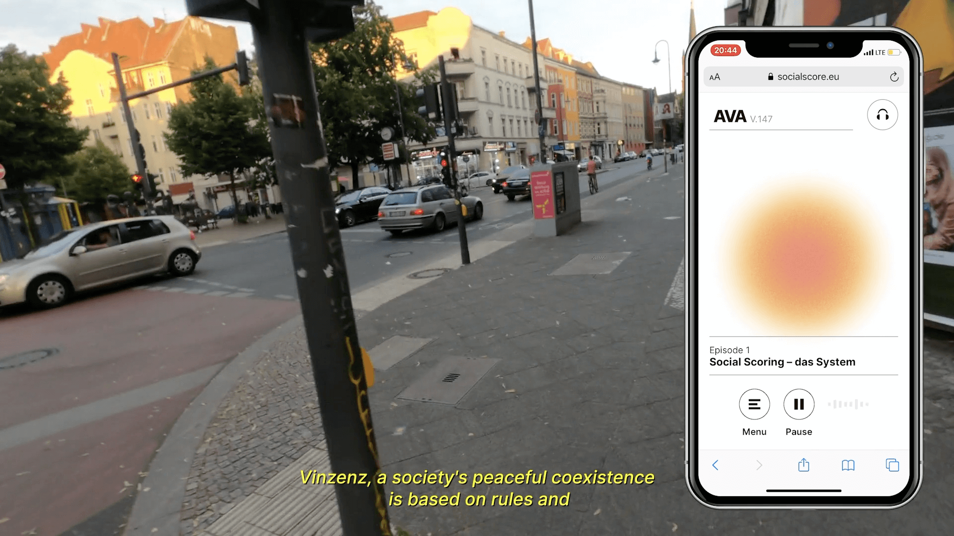 Social Score is the first interactive, participatory and location-based augmented audio experience that can be played directly in the browser. The fictious AI "AVA" negotiates the potential introduction of a social scoring system in Germany by sending the listeners on a personalised journey in their surroundings.