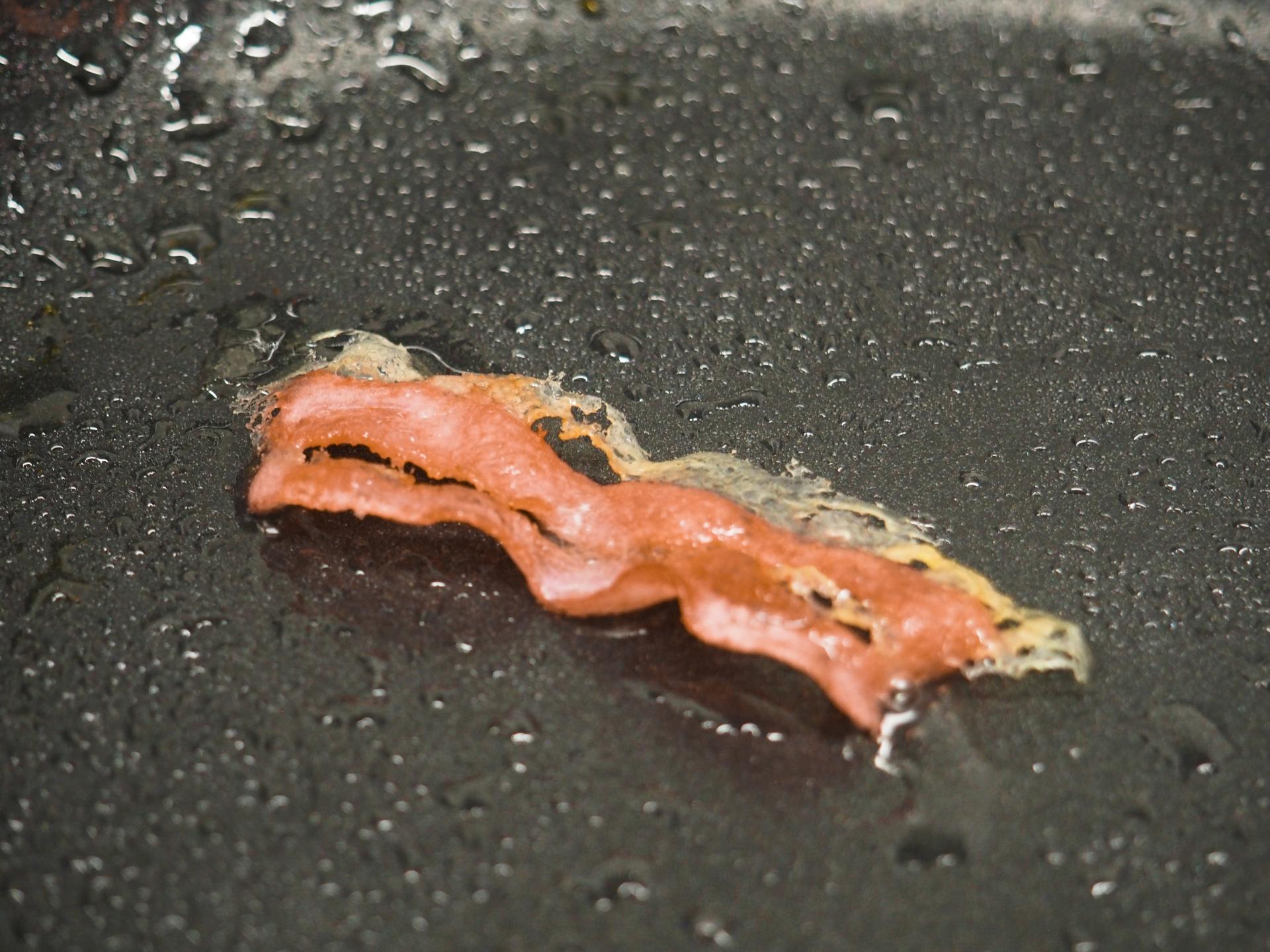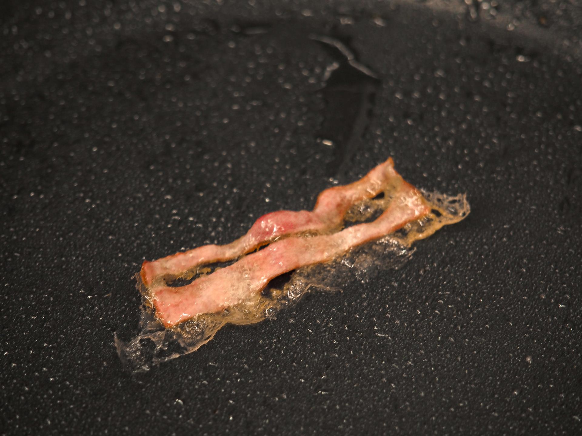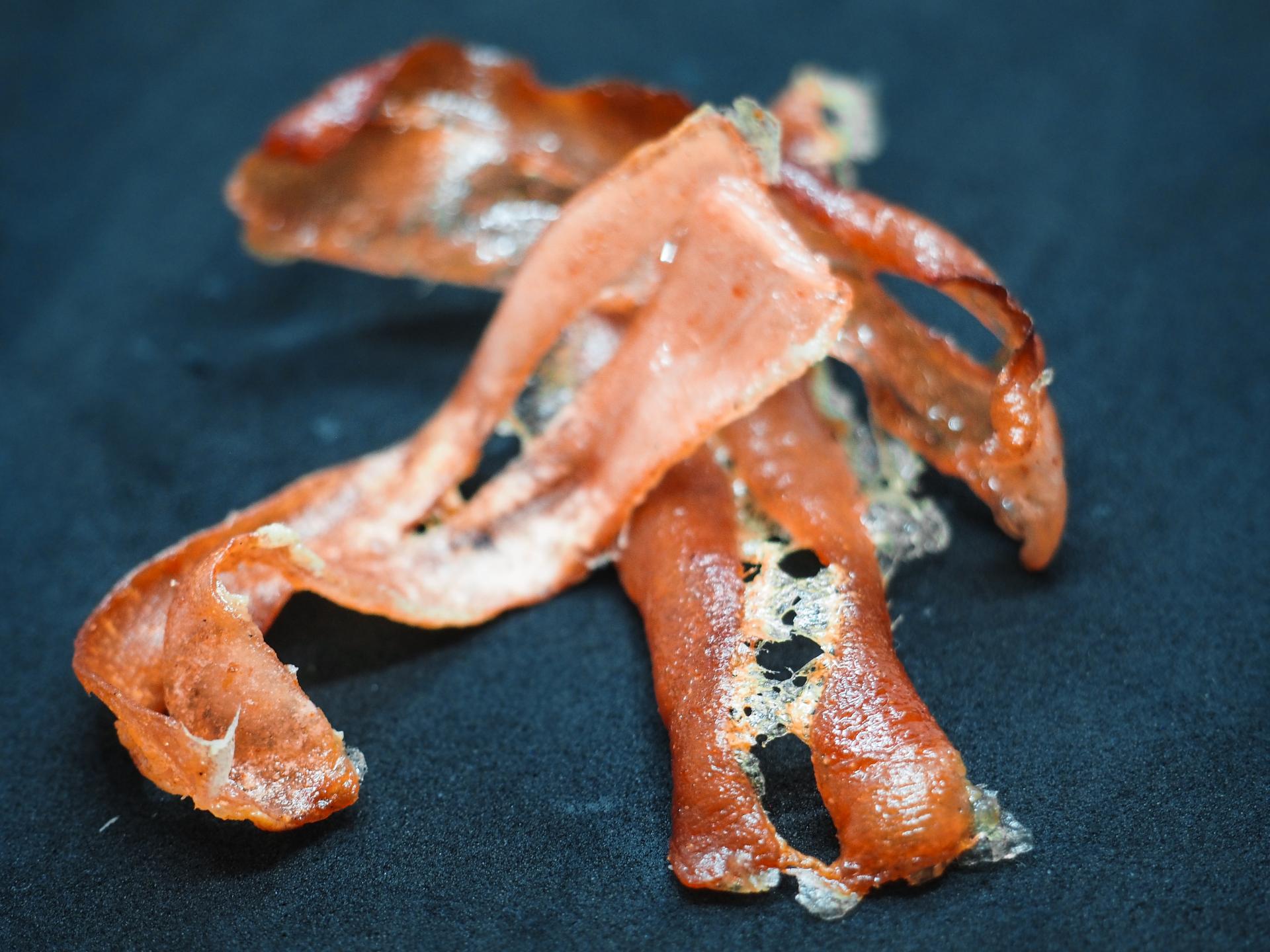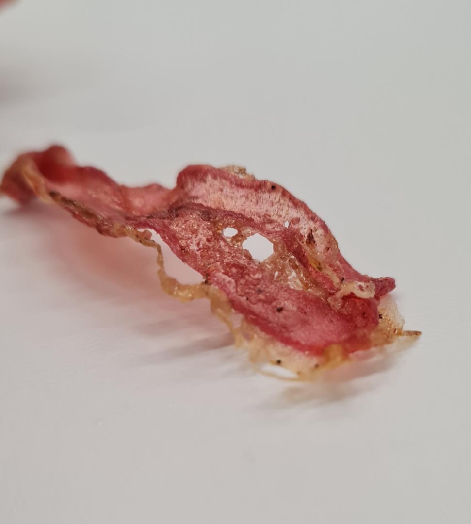 While the taste and texture of protein alternatives are crucial for their acceptance, their preparation also contributes to forming an experience around food and eating. Physical and chemical changes in food, during their preparation, do not only affect their texture and flavour but also our experiences and expectations of food. Researchers have investigated how creativity can support novel food practices that enrich interactions with food. For instance, playful gastronomy and eating practices, sensory-rich cooking practices, engagement with material (food) and use of new/smart technologies in the kitchen and at the table. Unfortunately, some of this playful sensorial experience can be lost when preparing a meal with plant-based meat substitutes which do not react to the cooking process the same way real meat does. Therefore, we have developed a product which not only provides a great texture and flavour of bacon but also has a similar cooking behaviour.