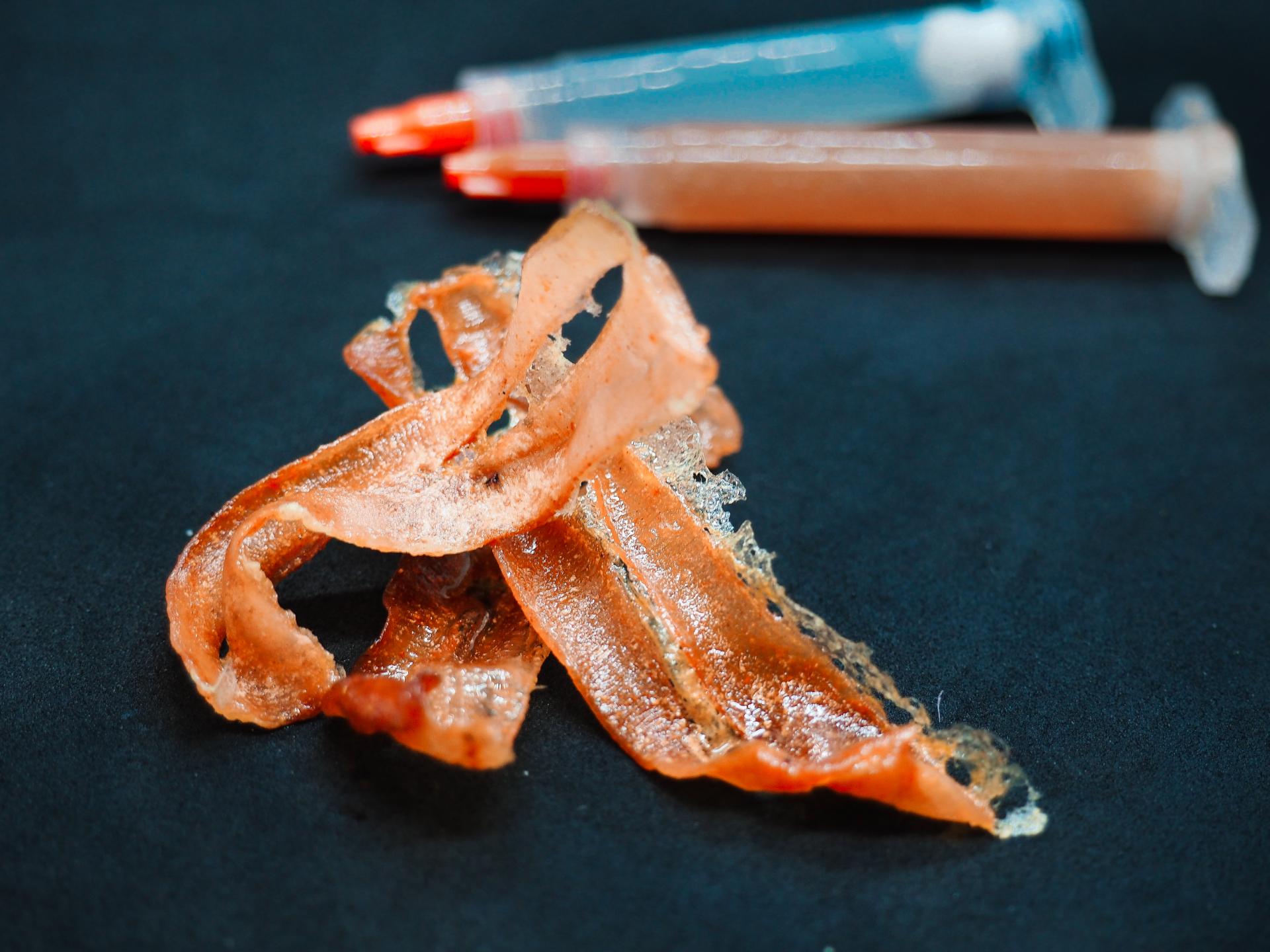 We want to provide customers with a plant-based alternative to bacon that does not compromise on experience. Therefore, we developed a plant-based product that covers all sensory aspects of eating and cooking with ordinary bacon. We use a variety of hydrogels and combine them via multi-material printing in a pattern resembling bacon’s structure and texture. The final product curls and shrinks during frying as bacon would, moreover it provides a great flavour and mouthfeel.