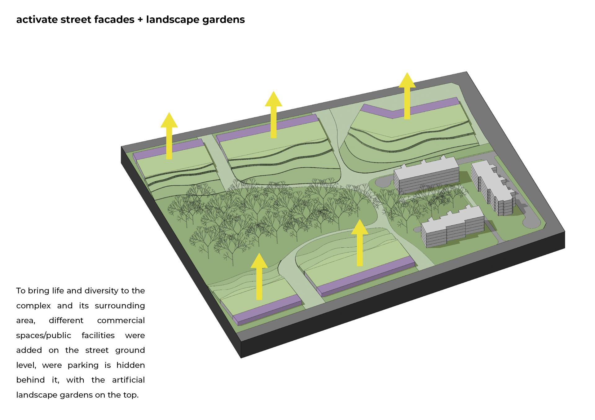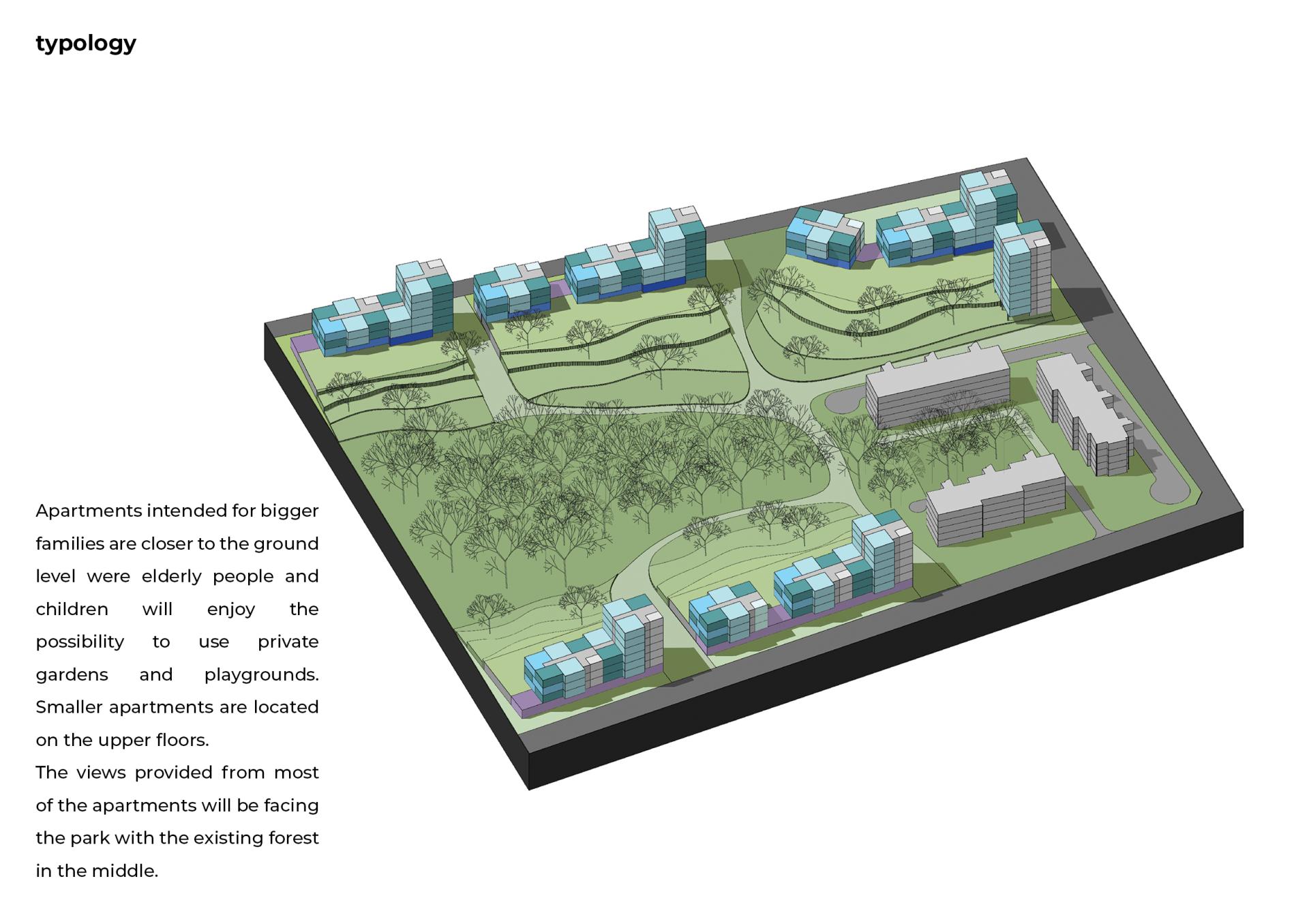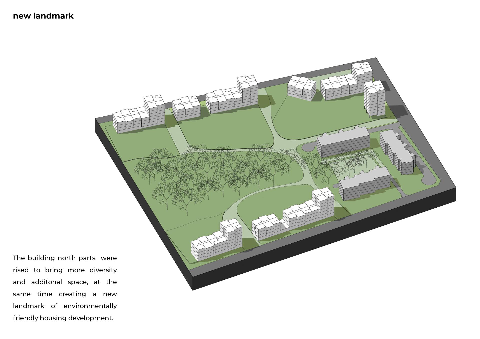 The residential towers ending on each residential block, featuring a landmark of new ecological development, will break strong horizontal geometric character. Together, all buildings will enclose a large green park with parking on the ground level, hidden under the artificial hilly landscape with private gardens on top of it and an existing forest in the middle, maximizing sunlight exposure and creating space for playgrounds.