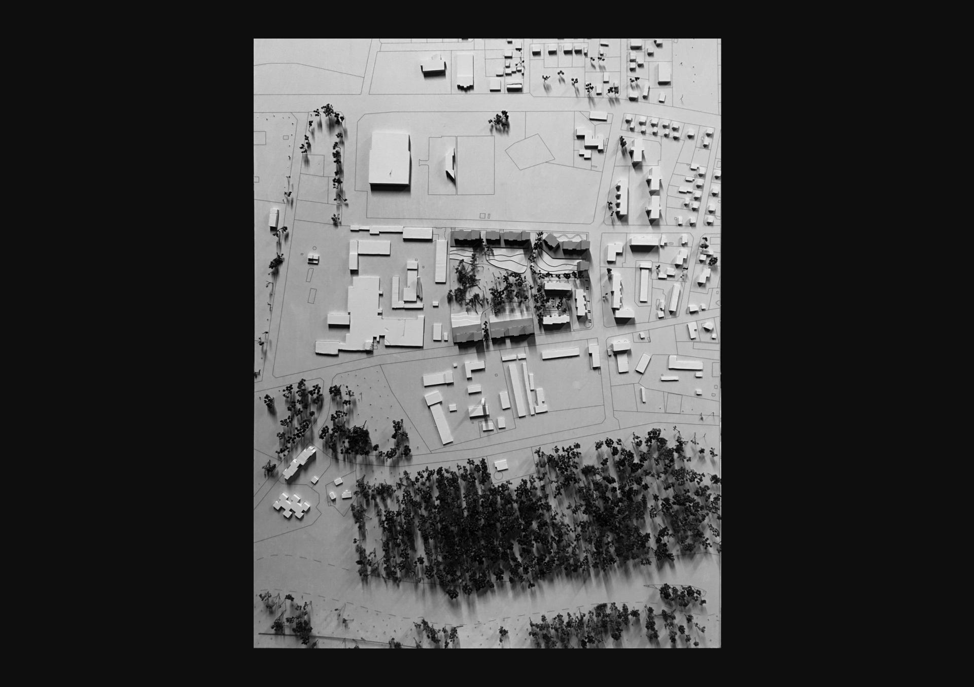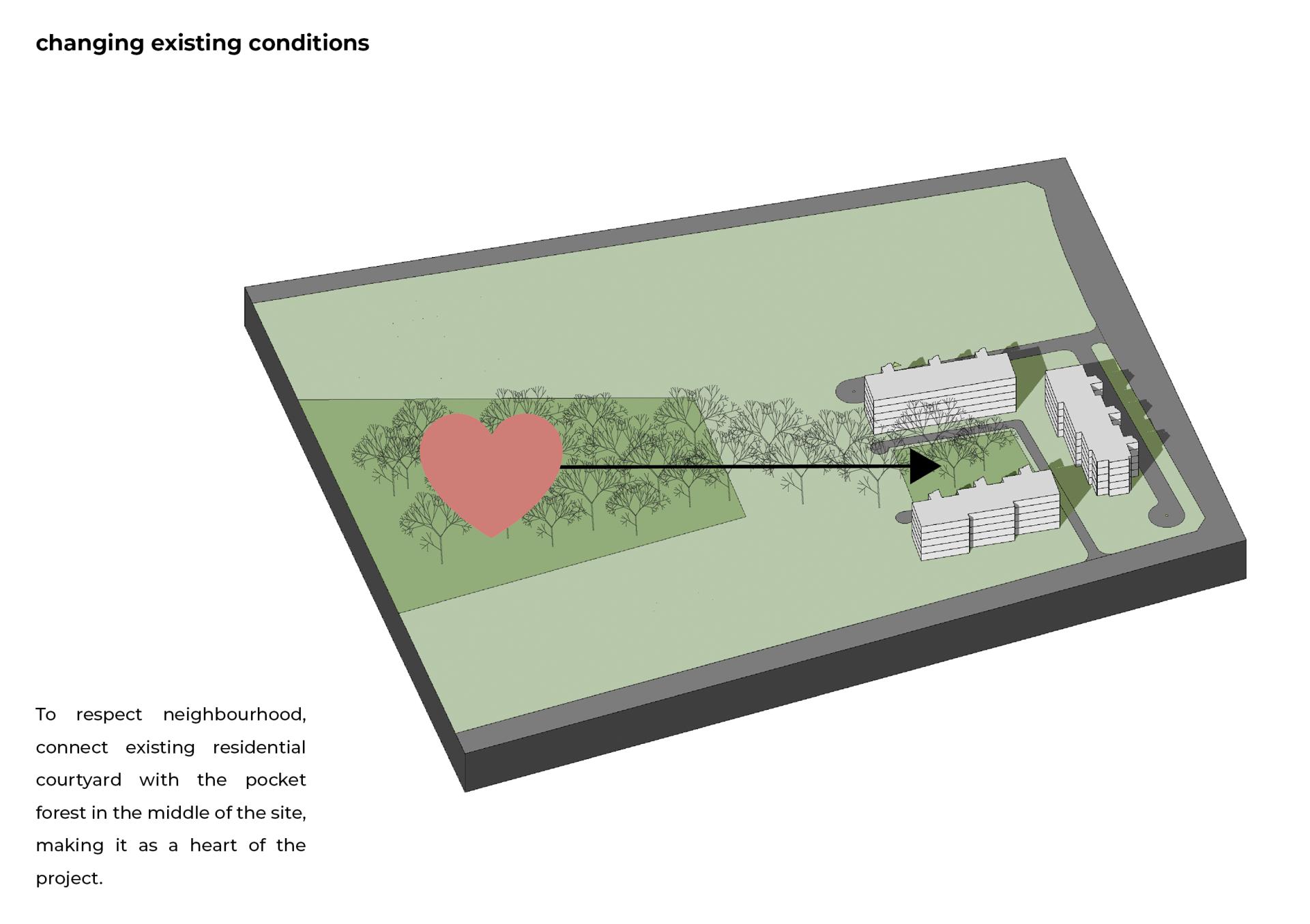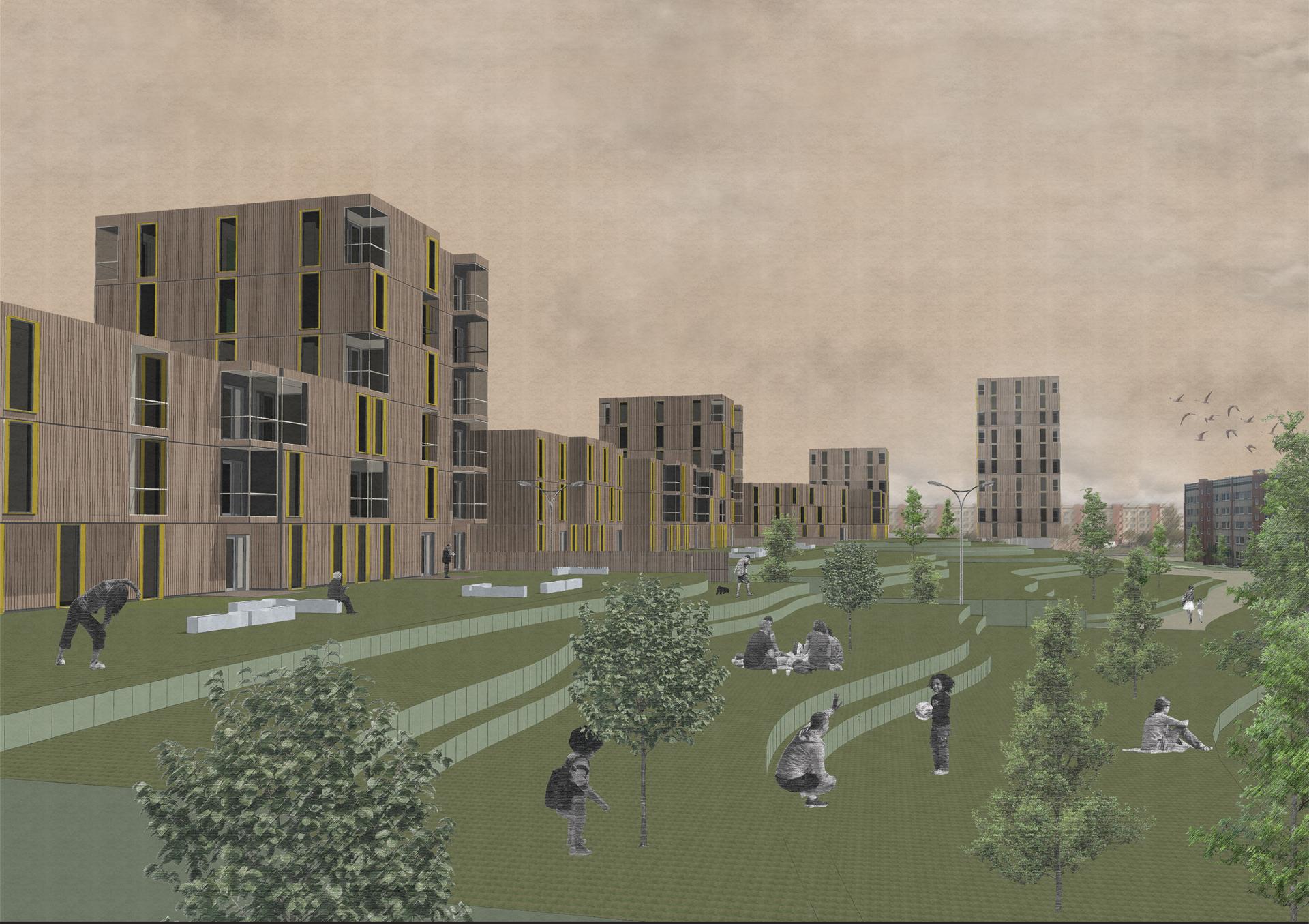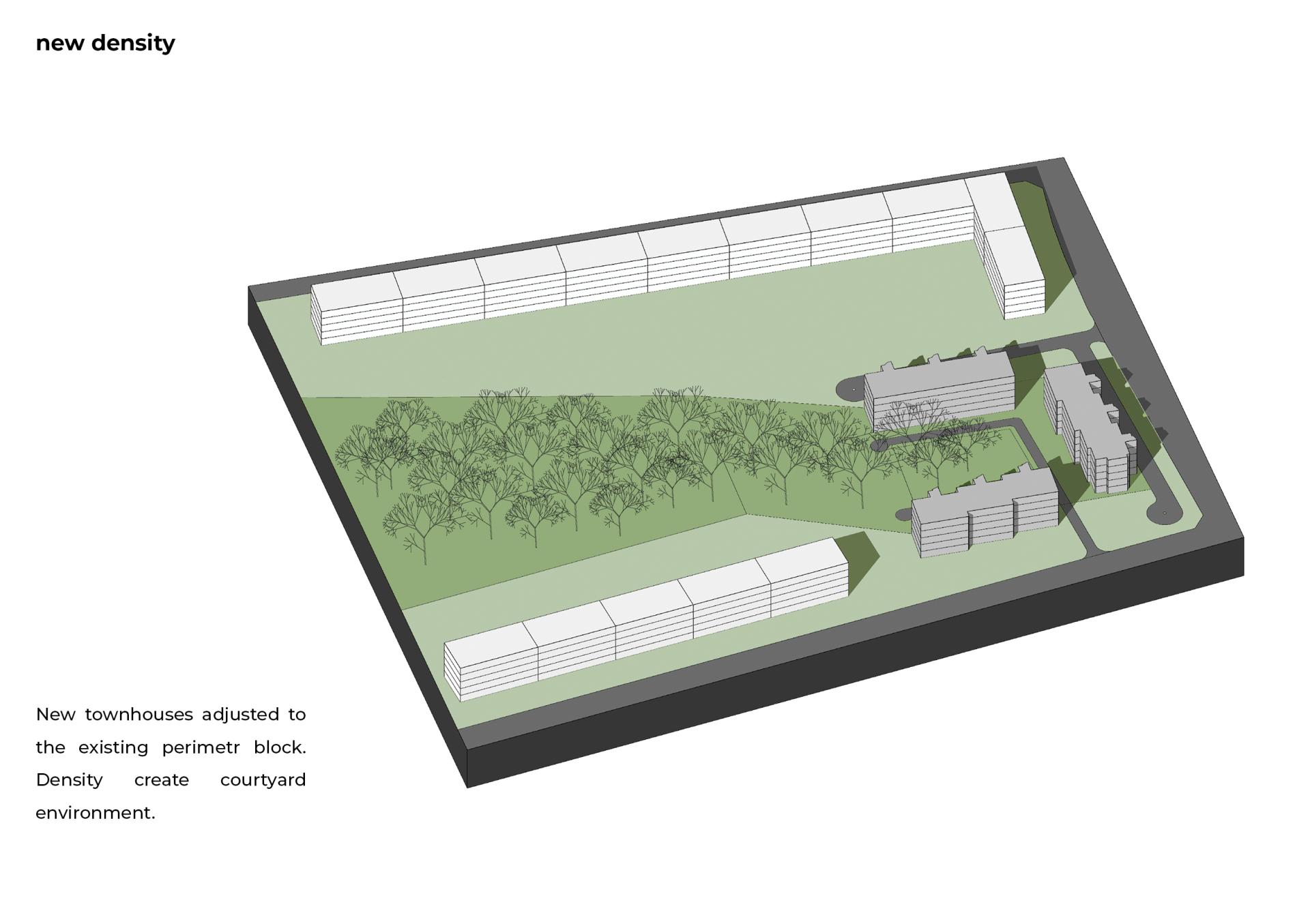 The residential towers ending on each residential block, featuring a landmark of new ecological development, will break strong horizontal geometric character. Together, all buildings will enclose a large green park with parking on the ground level, hidden under the artificial hilly landscape with private gardens on top of it and an existing forest in the middle, maximizing sunlight exposure and creating space for playgrounds.