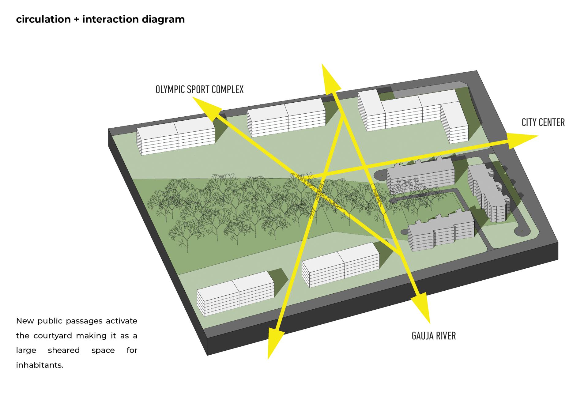Another feature of the project is to connect this park with the existing courtyard of soviet time buildings to the respect of their residents, where the new alleys will be connected to the existing pathways through the central part of the complex making it convenient to walk through the entire area.