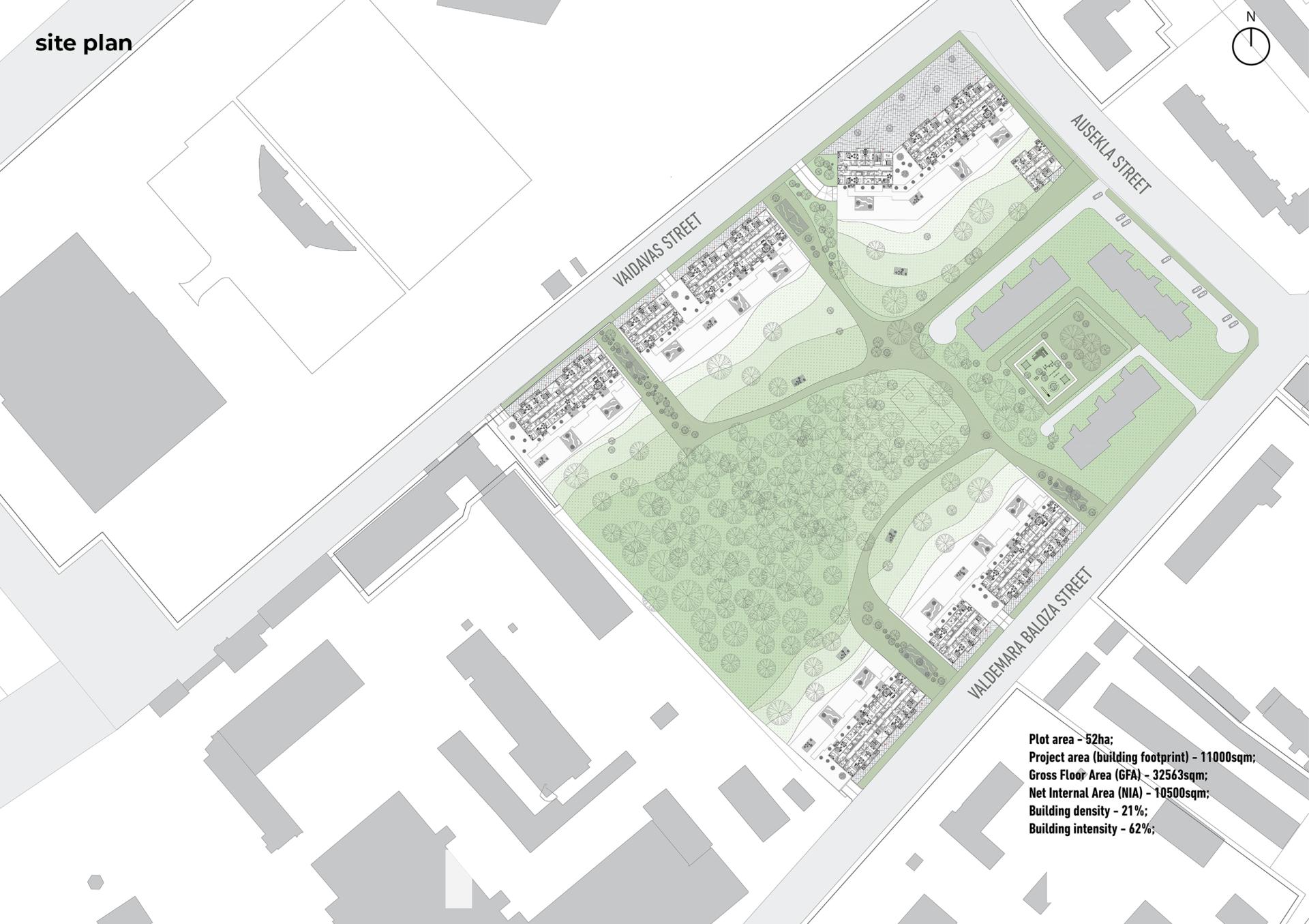 It will attempt to make the best possible use of the technical and aesthetical qualities of CLT and to create a wooden building on a large scale with a distinct architectonic expression of its own. The project would have diverse heights but mainly be designed on the human scale to meet and respect the neighbouring properties and streetscapes. The design will give a high level of usage and would create common internal courtyards from all sides of the buildings as a unique green recreational landscape, which would be gradually connected to the existing pocket forest in the middle of the site. Slender towers as vertical volumes with various heights would provide views of Valmiera and its green landscapes.